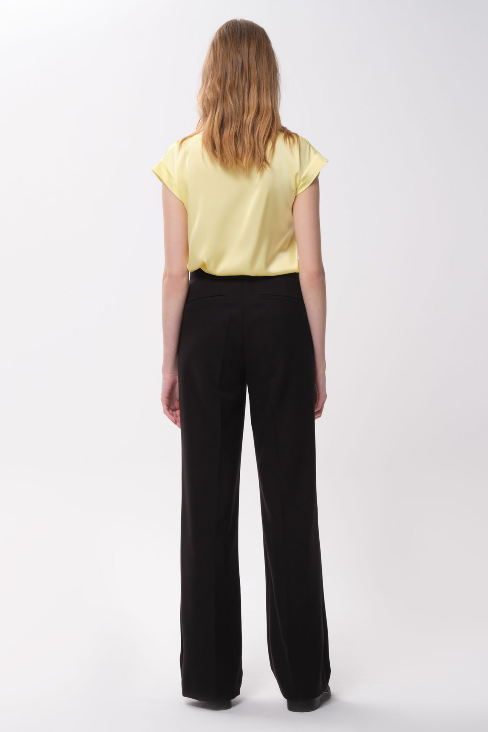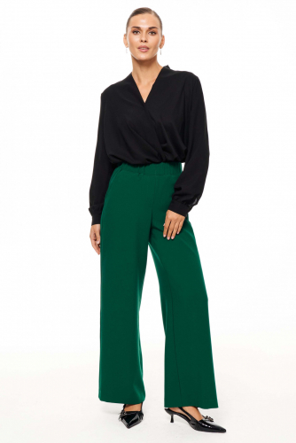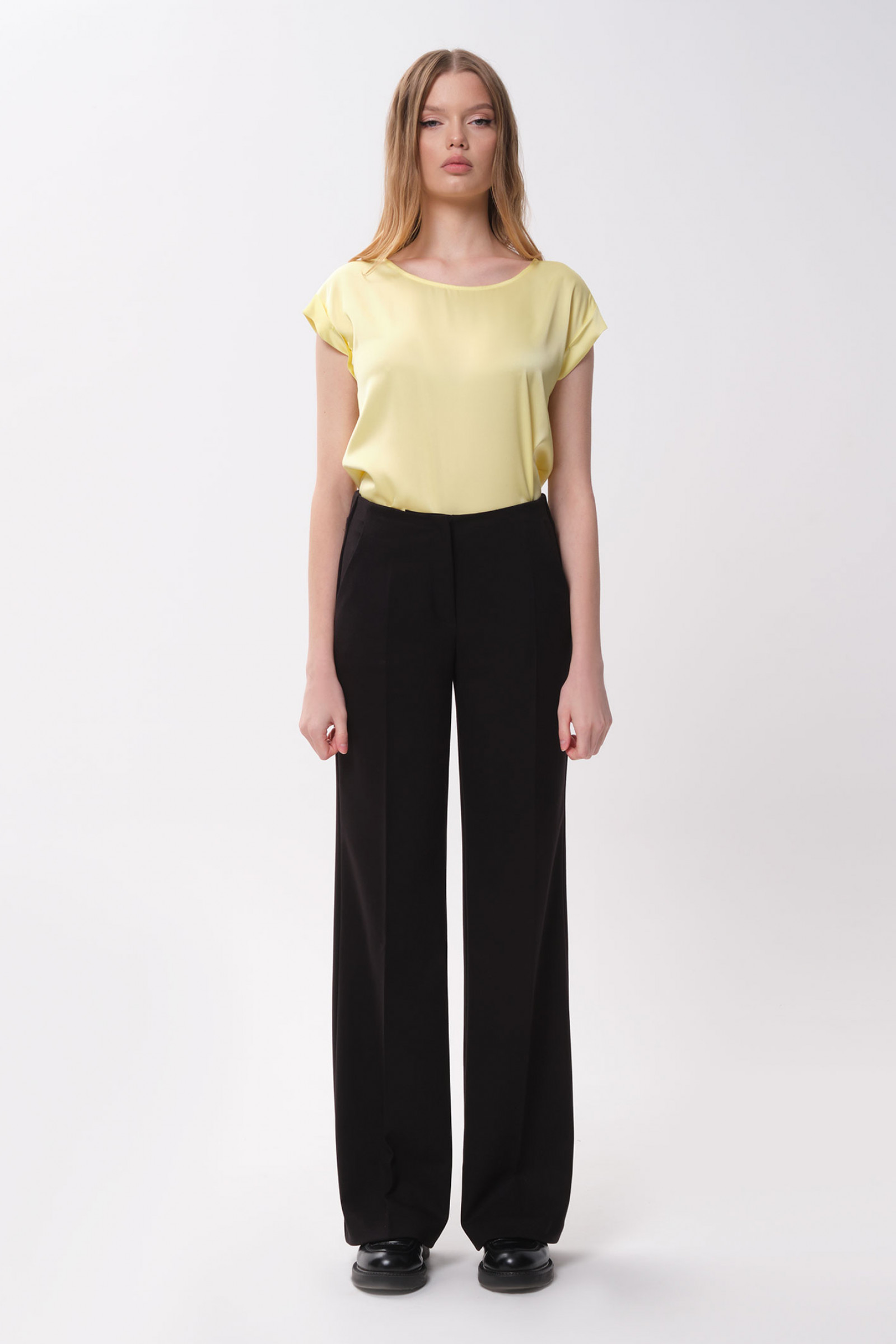 Брюки женские из поливискозной ткани для повседневной носки. Изделие прямого кроя с прорезными карманами в боковых швах. В заднюю часть пояса вставлена резинка. Длина классическая.