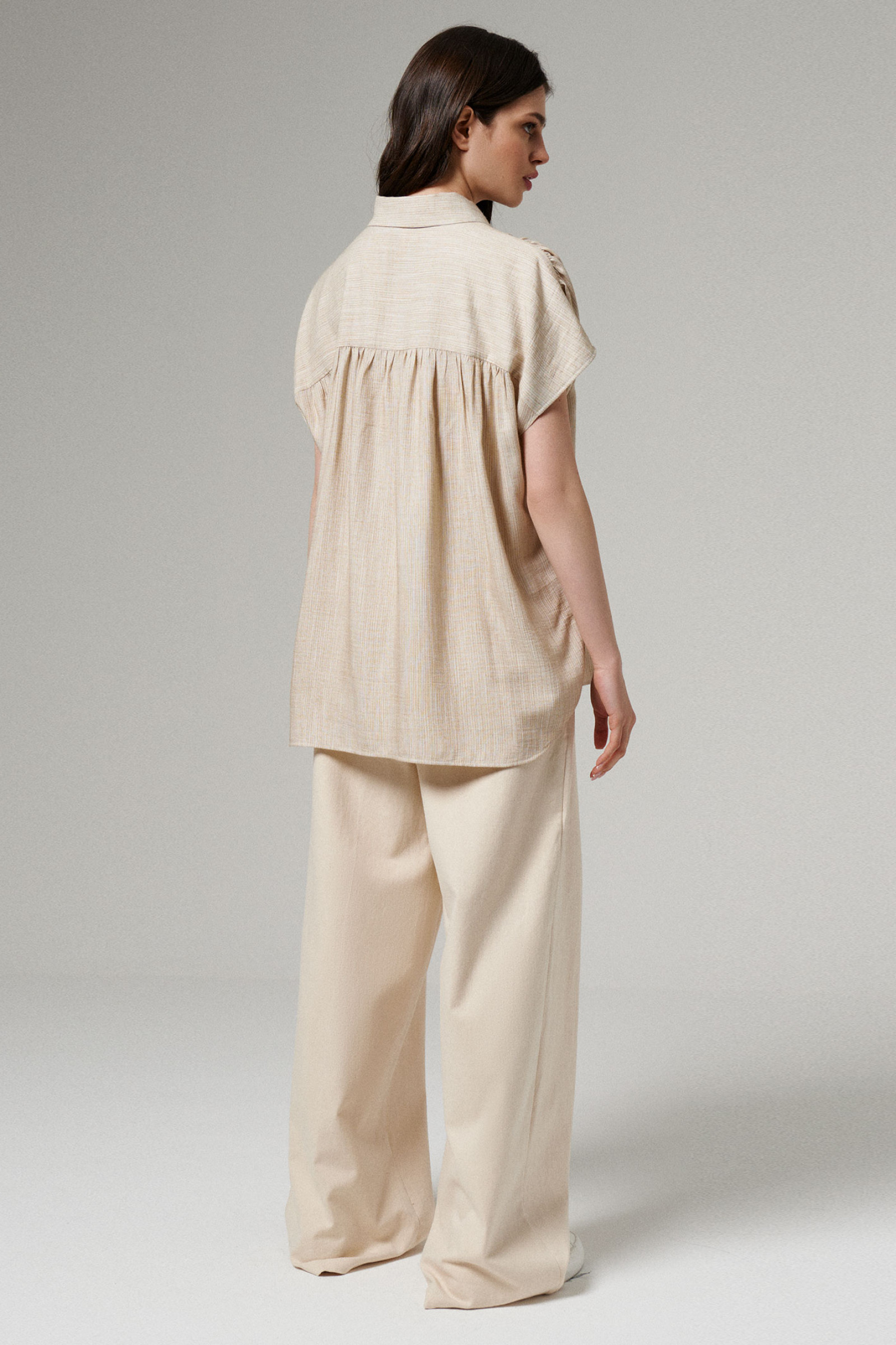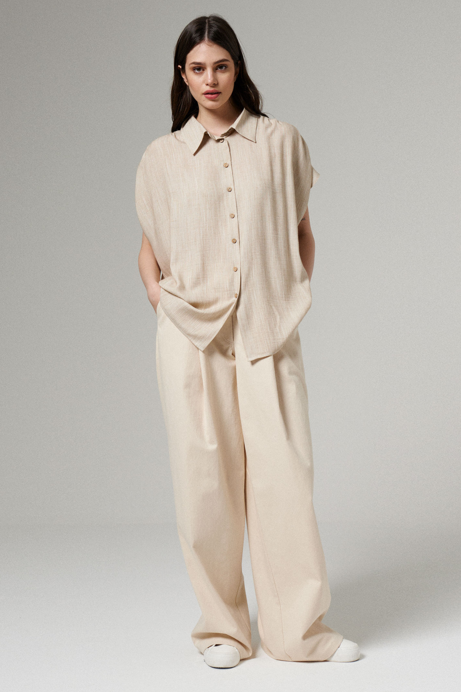 Брюки женские типа джинс. Брюки прямые, широкие, с отрезным поясом на петлю пуговицу, застежка на тесьму- молнию, по поясу есть шлёвки. По переду от пояса заложены складки, а также в боковых швах два кармана. На задних частях брюк вытачки от пояса и два настрочных кармана фигурной формы. Создать стильный, свободный образ помогут хлопковые брюки. Брюки удачно сочетаются со спортивной обувью и лоферами.