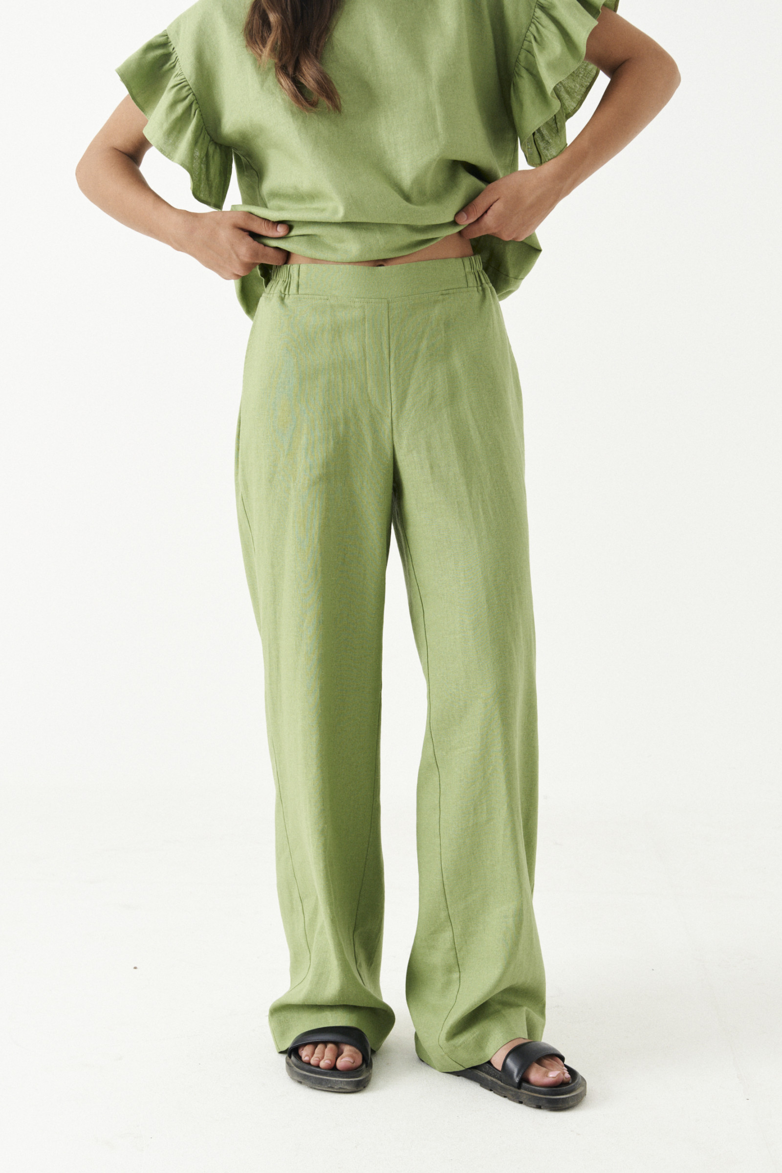 Прямые широкие брюки – удобная одежда, повседневной носки и особых случаев. Стильные брюки для прямые по силуэту. Пояс, дополненном резинкой, что очень удобно. В области боковых швов располагаются прорезные карманы. Отлично сочетается с блузками, футболками, топами, майками, жакетами. Данные брюки пошиты из льняной ткани. Льняная ткань обладает гигроскопичностью, воздухопроницаемостью и подойдёт для жарких дней. Заказывайте летние брюки больших размеров, чтобы пополнить свой сезонный гардероб практичной вещью.