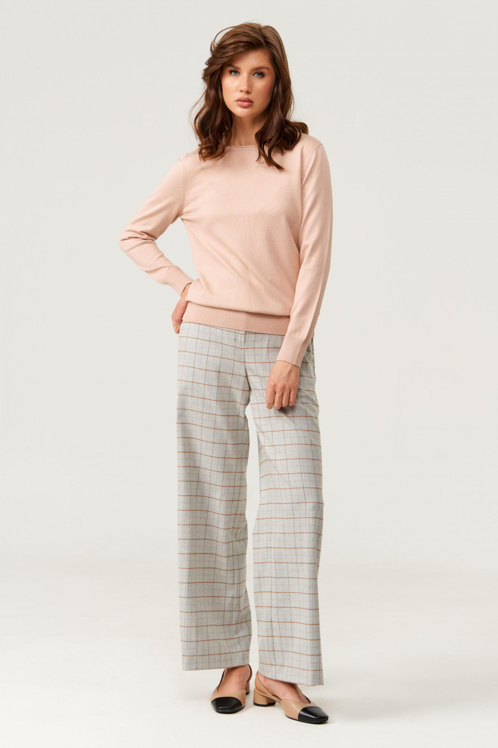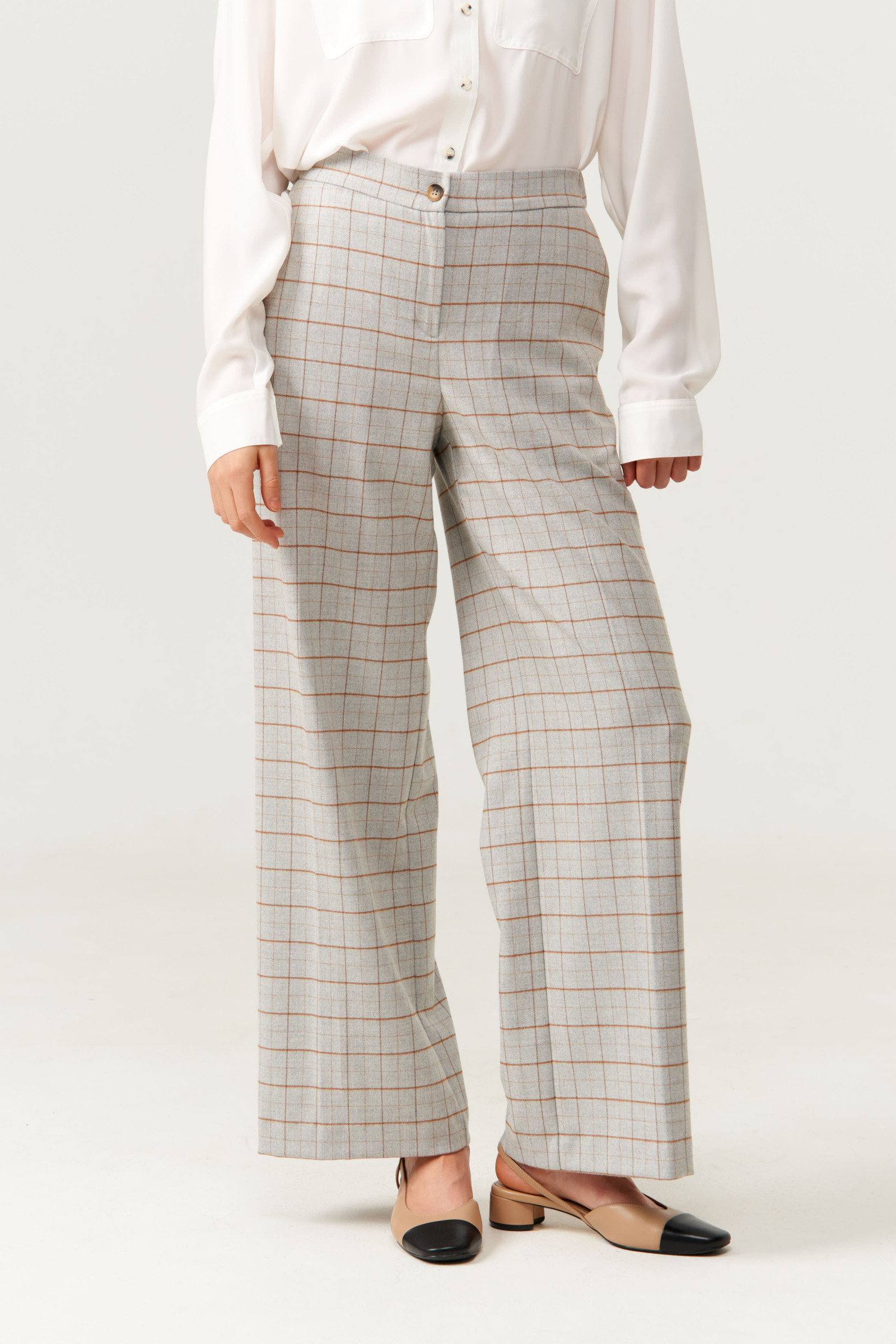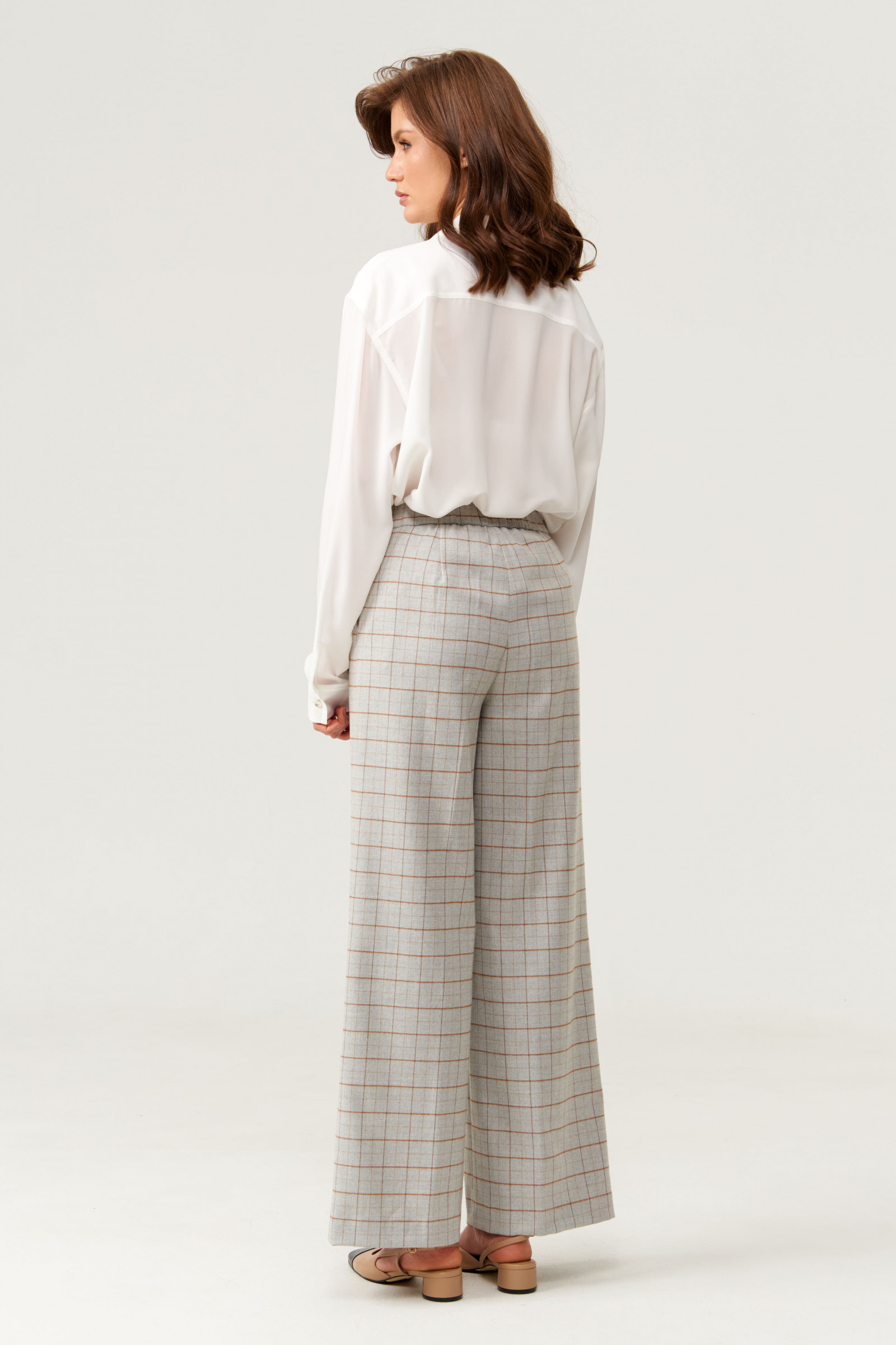 Брюки женские прямые из смесовой ткани в клетку для повседневной носки. Верхний срез брюк обработан притачным поясом, по задней части брюк присутствует пояс с вставкой на резинке. Застежка на одну петлю и одну пуговицу, а также имеется застежка на тесьму-молнию в среднем шве брюк. В брюках расположен в боковом шве карман с подкройным бочком. Отличный классический вариант брюк, которые будут гармонично смотреться под любые изделия.