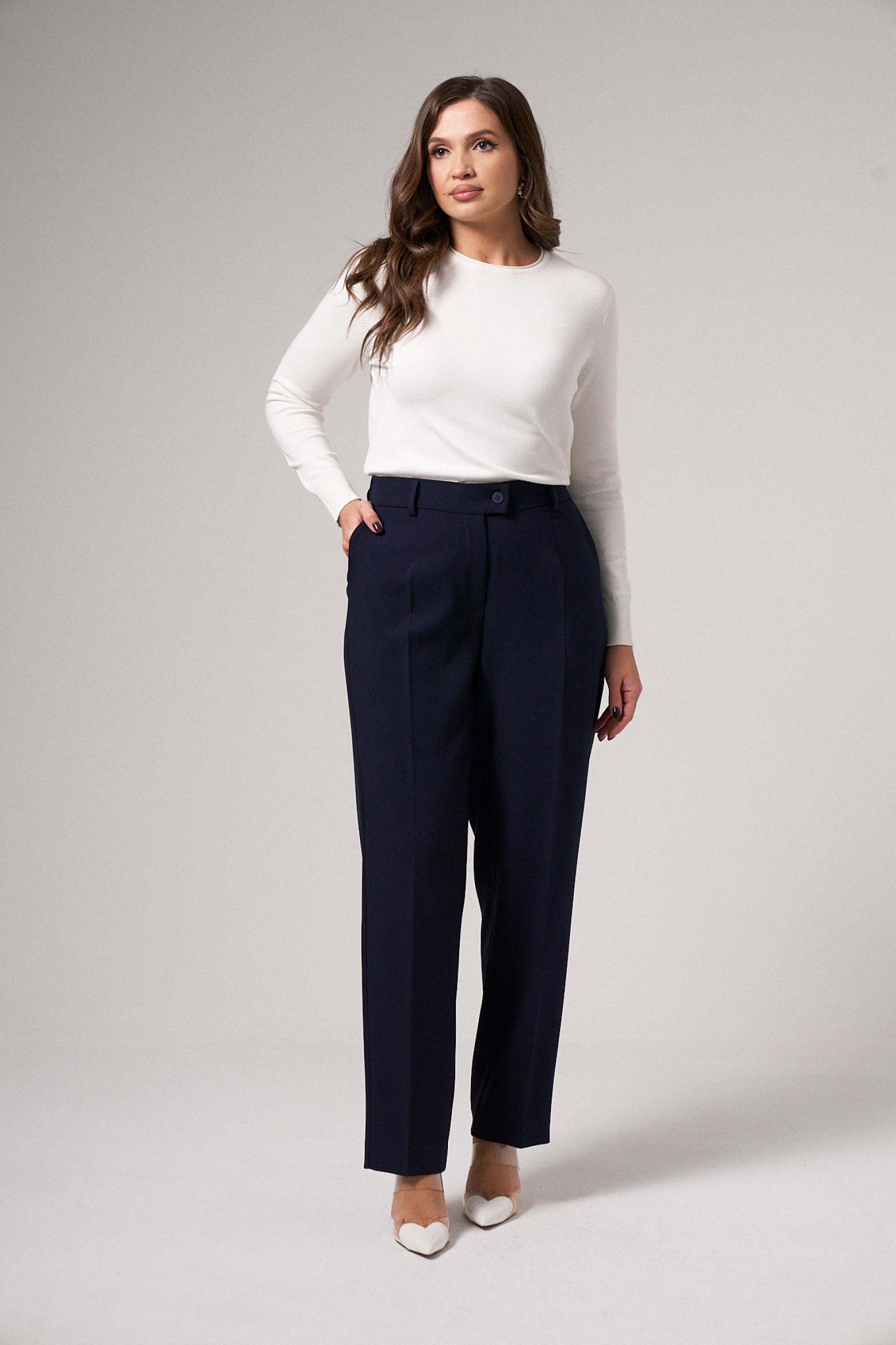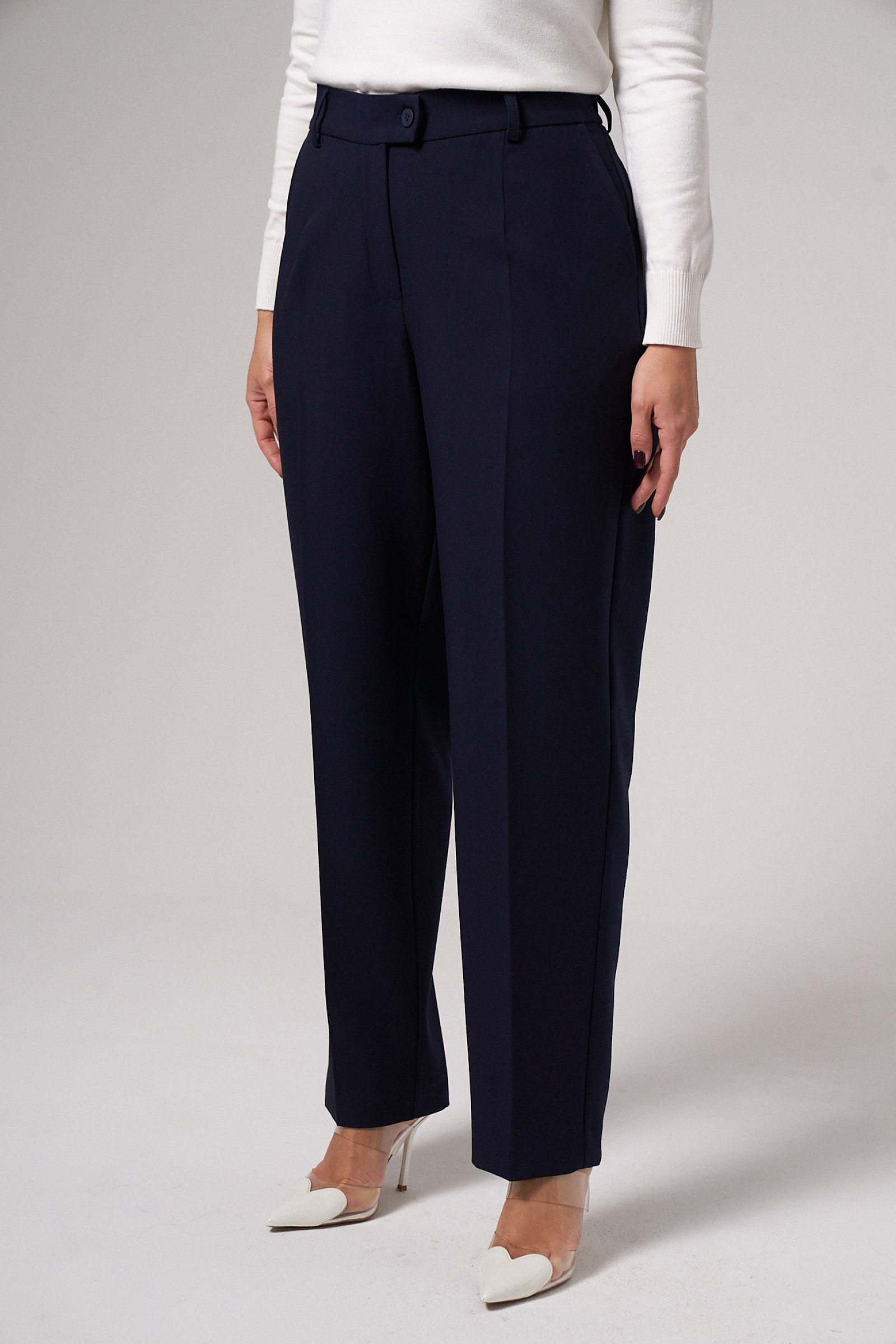 Брюки женские прямые из смесовой ткани для повседневной носки. Верхний срез брюк обработан притачным поясом, по задней части брюк присутствует пояс с вставкой на резинке. Застежка на одну петлю и одну пуговицу, а также имеется застежка на тесьму-молнию в среднем шве брюк. Передняя часть брюк имеет две талиевые вытачки. Задняя часть брюк имеет две талиевые вытачки и два кармана с листочкой. В брюках расположен в боковом шве карман с подкройным бочком и с небольшими разрезами к низу изделия. Отличный классический вариант брюк, которые будут гармонично смотреться под любые изделия.