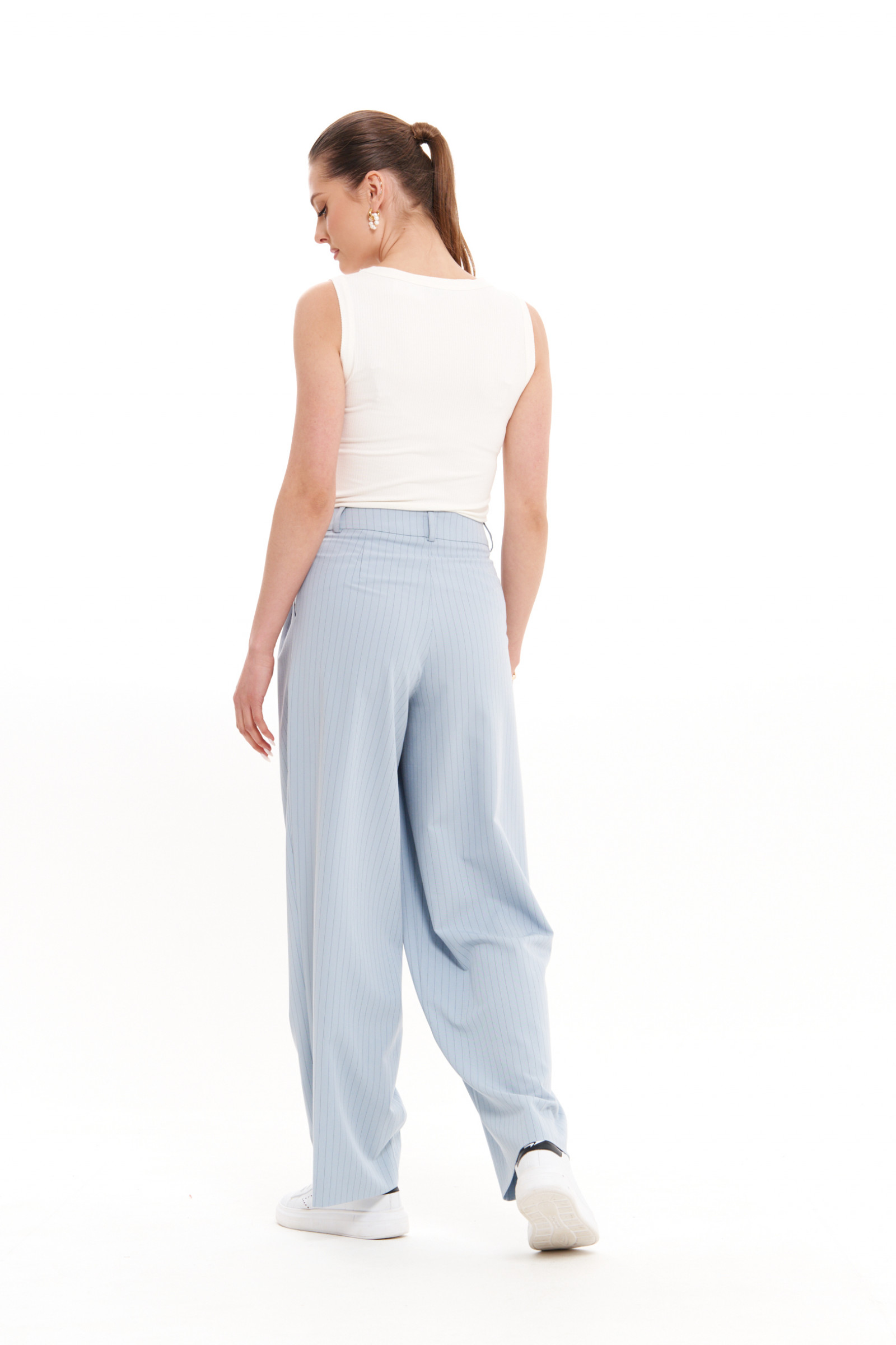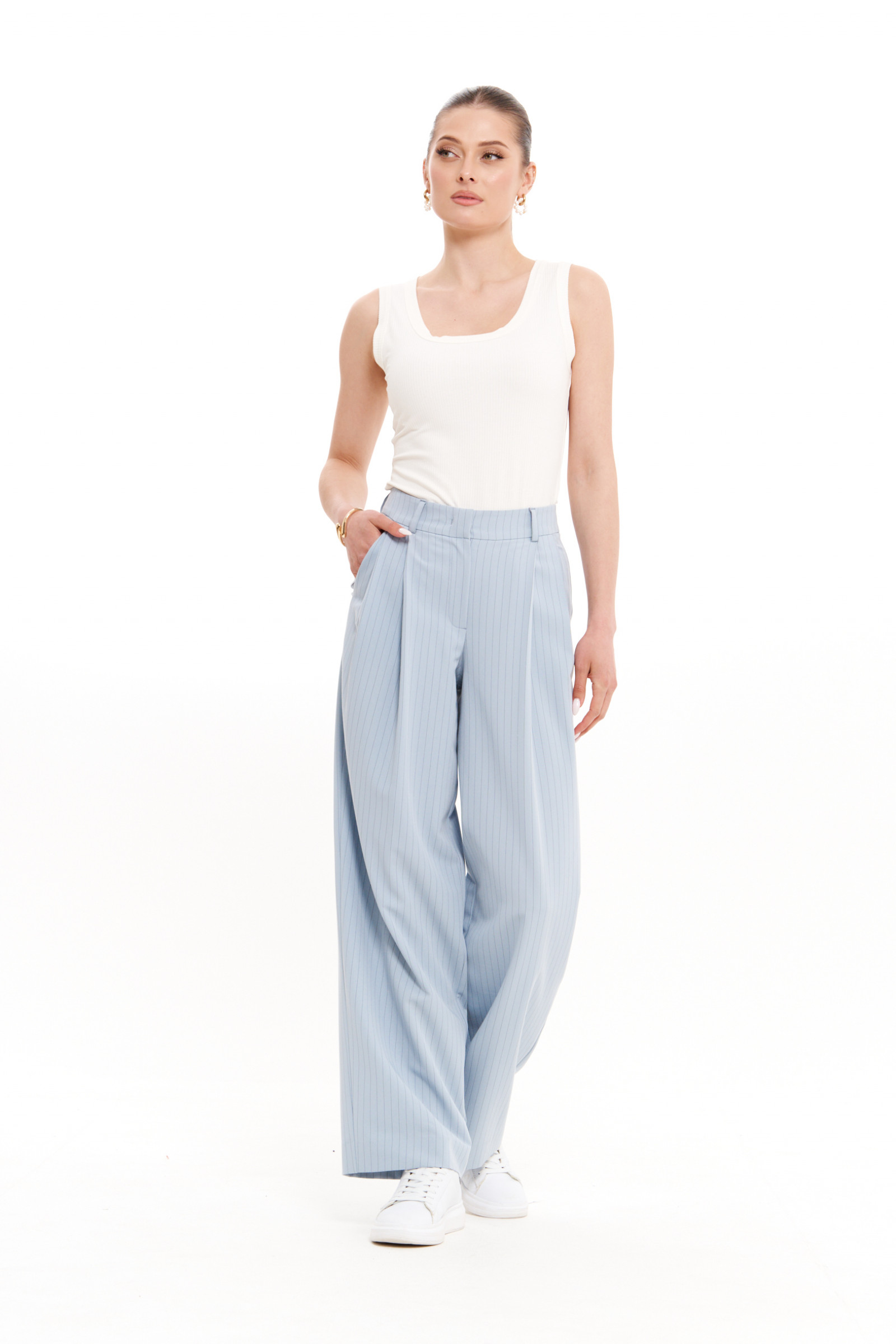 Голубой оттенок делает эти женские брюки идеальным вариантом для создания гармоничных ансамблей. Их можно комбинировать с базовыми рубашками, блузами или пиджаками для офисного лука или сочетать с нарядными топами для праздничных мероприятий. Свободный крой обеспечивает комфорт в повседневной носке, а классический дизайн делает их уместными в любых ситуациях. Эти брюки – must-have для современной женщины, ценящей стиль, удобство и универсальность.