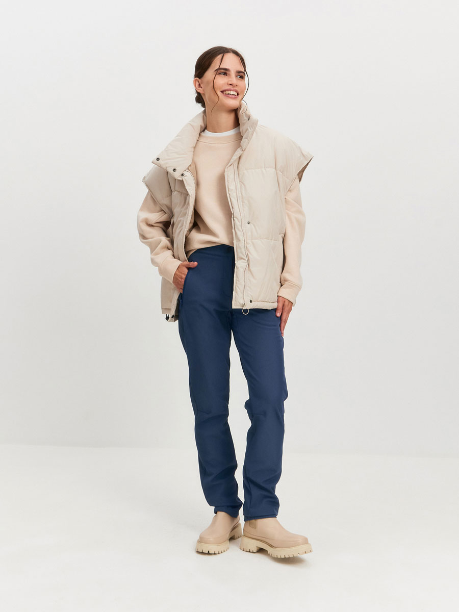 Женские брюки из софтшелла, с гульфиком на молнии. Пояс брюк с патами на липучке для регклировки прилегания, застегивается на пуговицу. 2 прорезных верхних  кармана с молниями. Низ брюк прямой. Посадка брюк облегающая, для классической посадки рекомендуем брать на размер больше. Рассчитаны на температуру от +5 до +15.