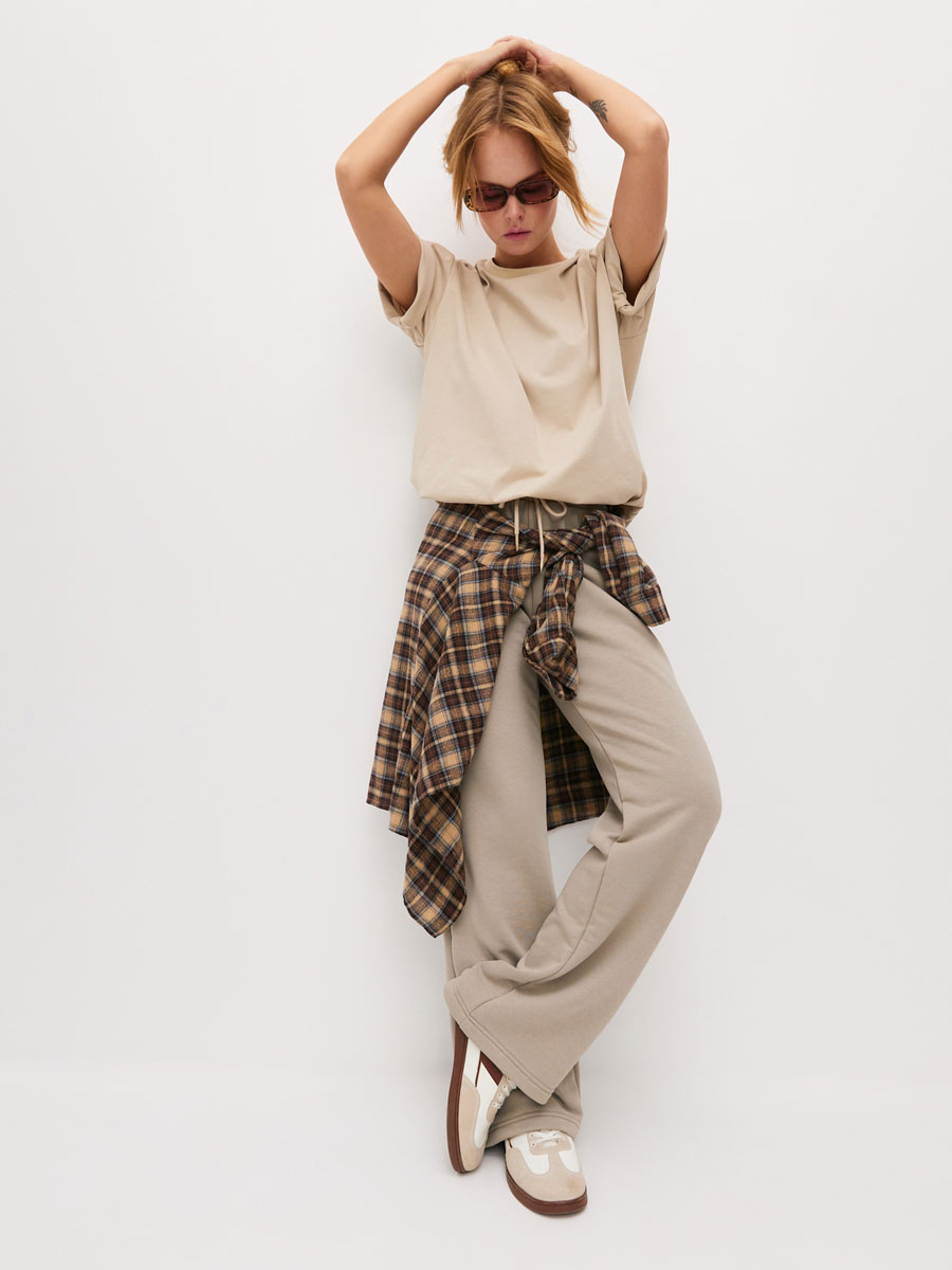 Женские брюки из футера 3-х нитка петля, прямые, с отрезным поясом, строчёным с эластичной тесьмой. С наружной стороны пояса через петли продет шнур. В боковых швах брюк - карманы с закрепками. Низ брюк прямой подшит на плоскошовной машине.