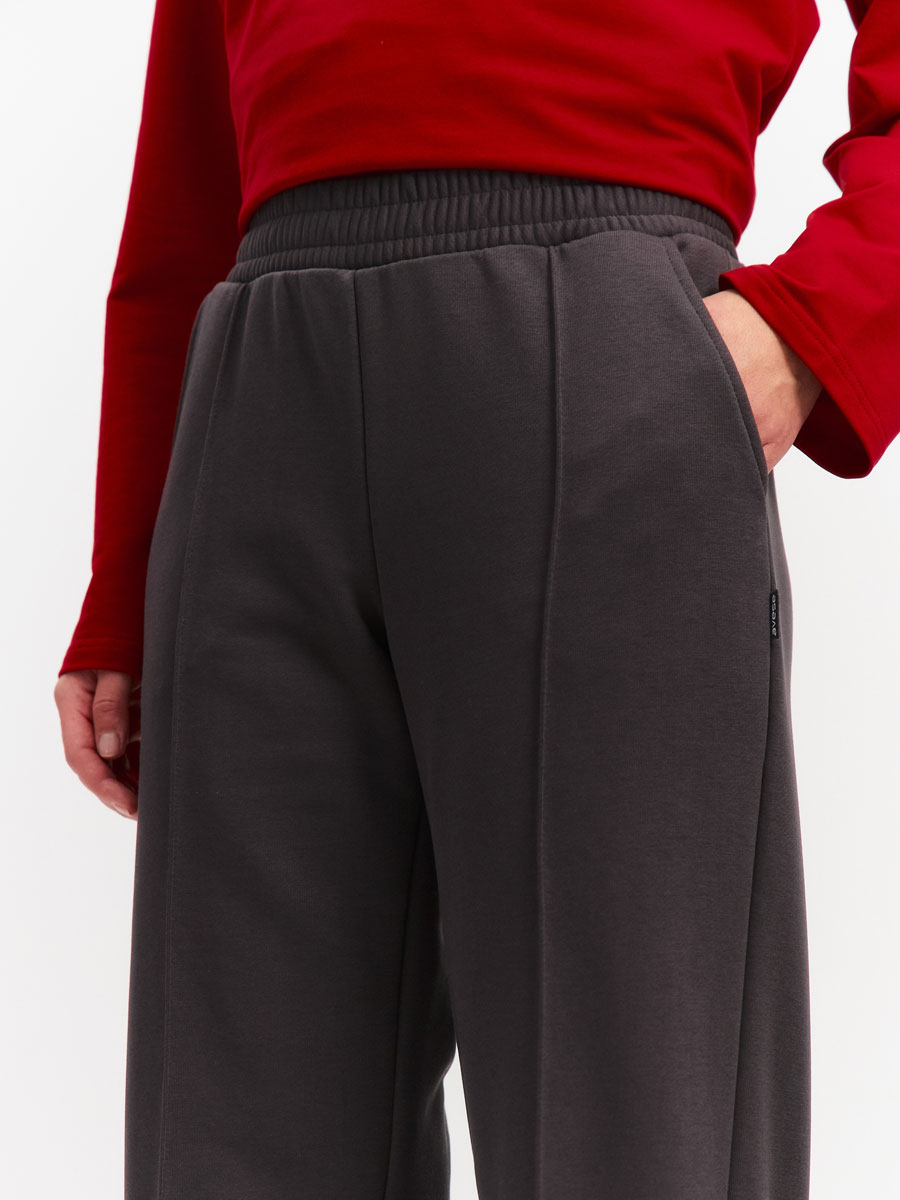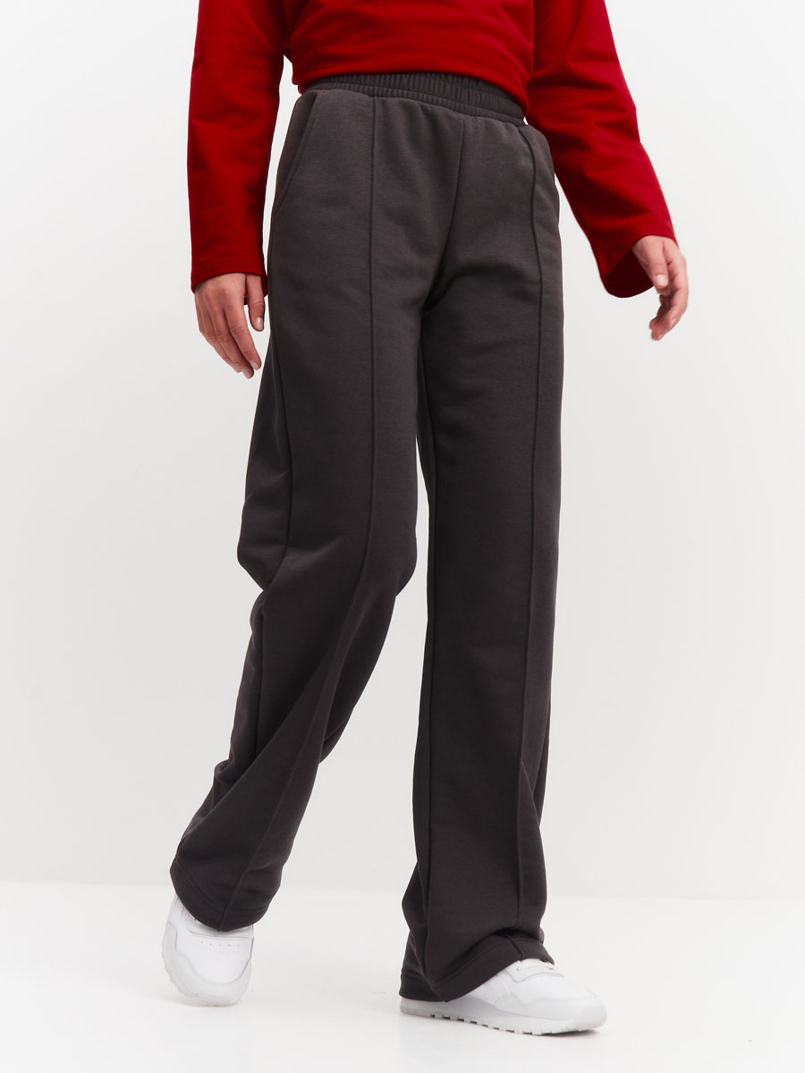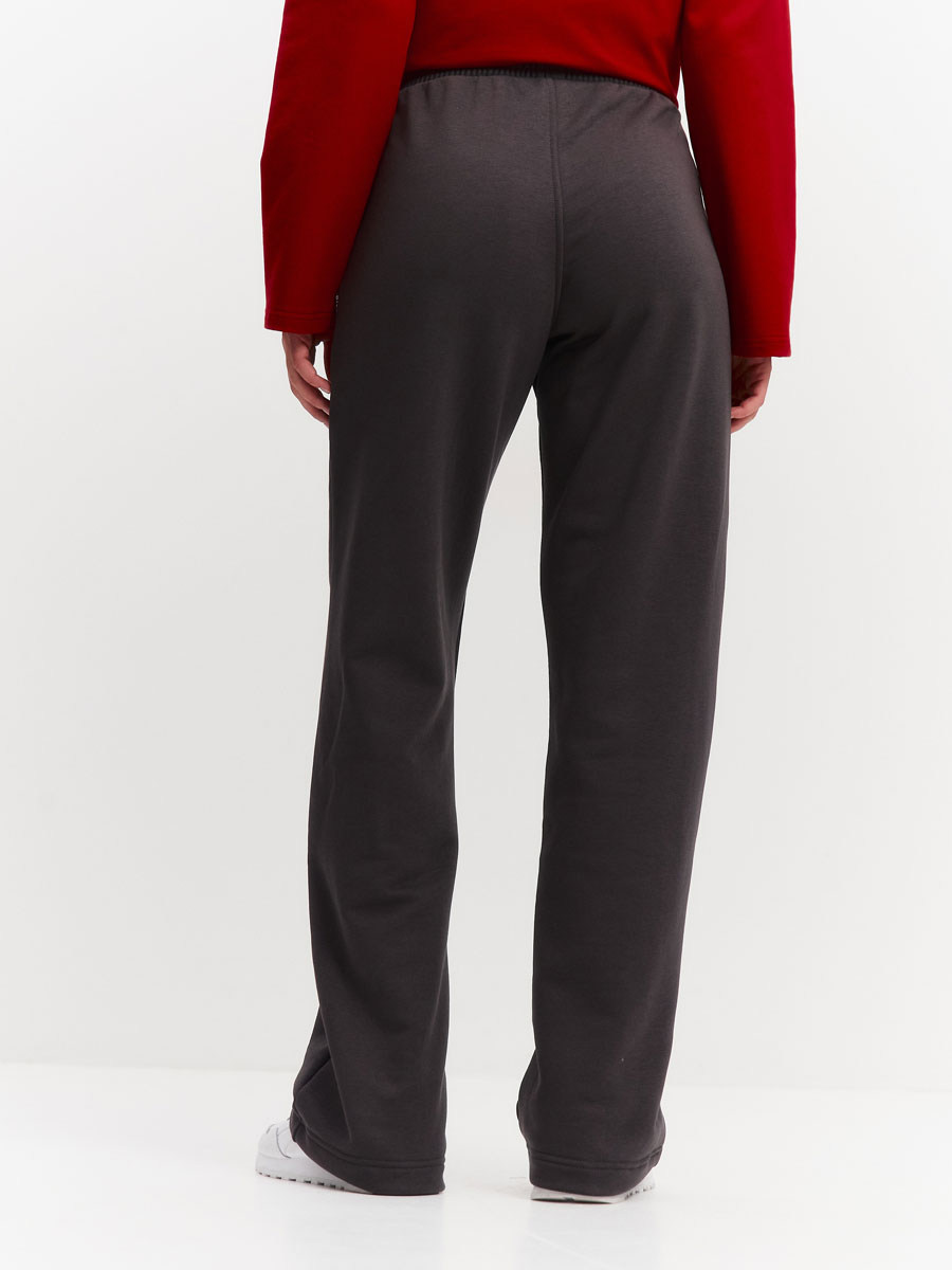 Женские брюки из футера 3-х нитка диагональ, прямые, со стрелками на передних половинках брюк, с отрезным поясом, строчёным с эластичной тесьмой. С изнаночной стороны пояса петли, через которые продет шнур. В боковых швах брюк – карманы. Низ брюк подшит на плоскошовной машине.