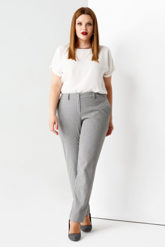 Брюки женские больших размеров с высокой посадкой, слегка зауженными к низу штанинами и классической застежкой гульфик. В отрезном поясе прорезная петля для пуговицы. Застежку, вшитую в серединный шов, закрывает откосок. Брюки деловые дополнены шлевками под пояс и боковыми карманами.