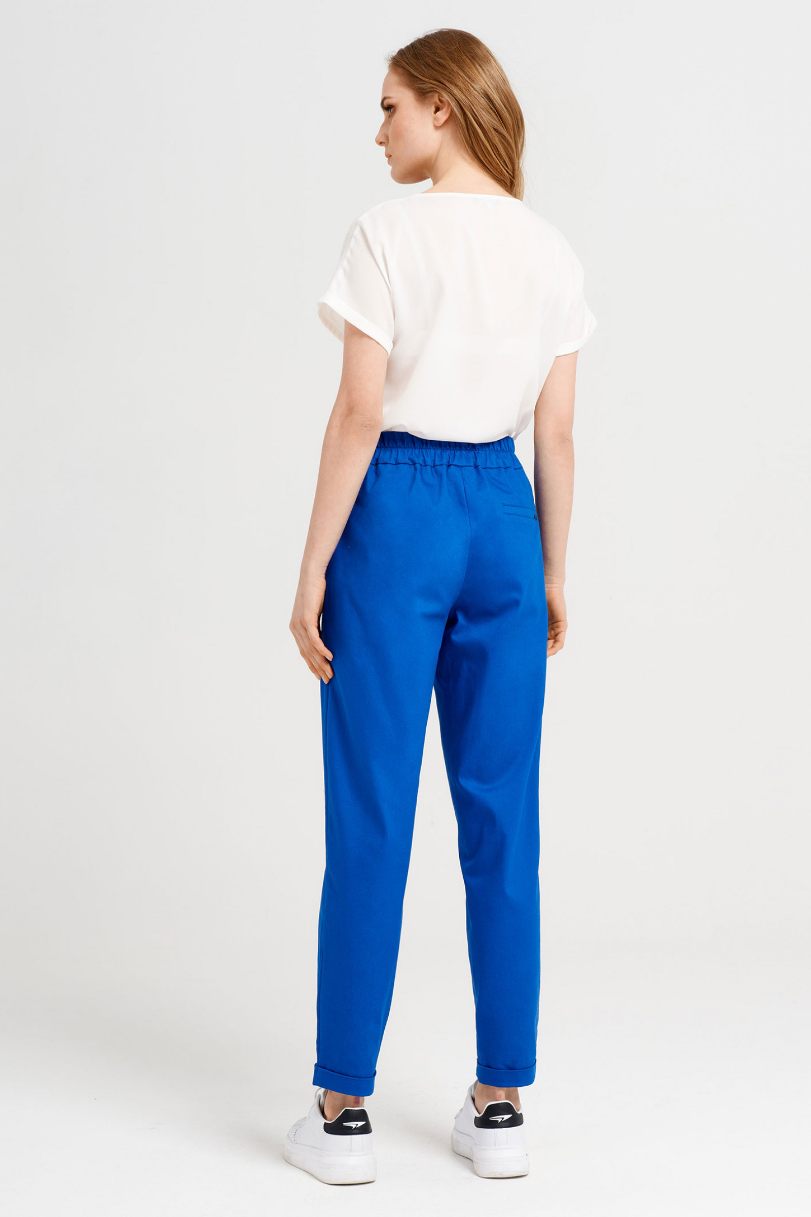 Очень стильные и комфортные брюки модного силуэта выполнены из плотной и держащей форму эластичной ткани, У брюк высокая посадка и отрезной пояс по талии,образующий спереди завязку на увесистую стильную пряжку.Застёжка спереди на гульфик с молнией и петлю-пуговицу. От верхнего среза брюк спереди к боковым швам выполнены косые входы во внутренние карманы. Также по переду от талии выполнены две односторонние складки. Брючины расширены и снизу заужены за счёт защипов,выполненных от нижнего среза. По низу изделия выполнены отложные манжеты. Брюки не сковывают движения и подчёркивают изящность и стройность фигуры их обладательницы.