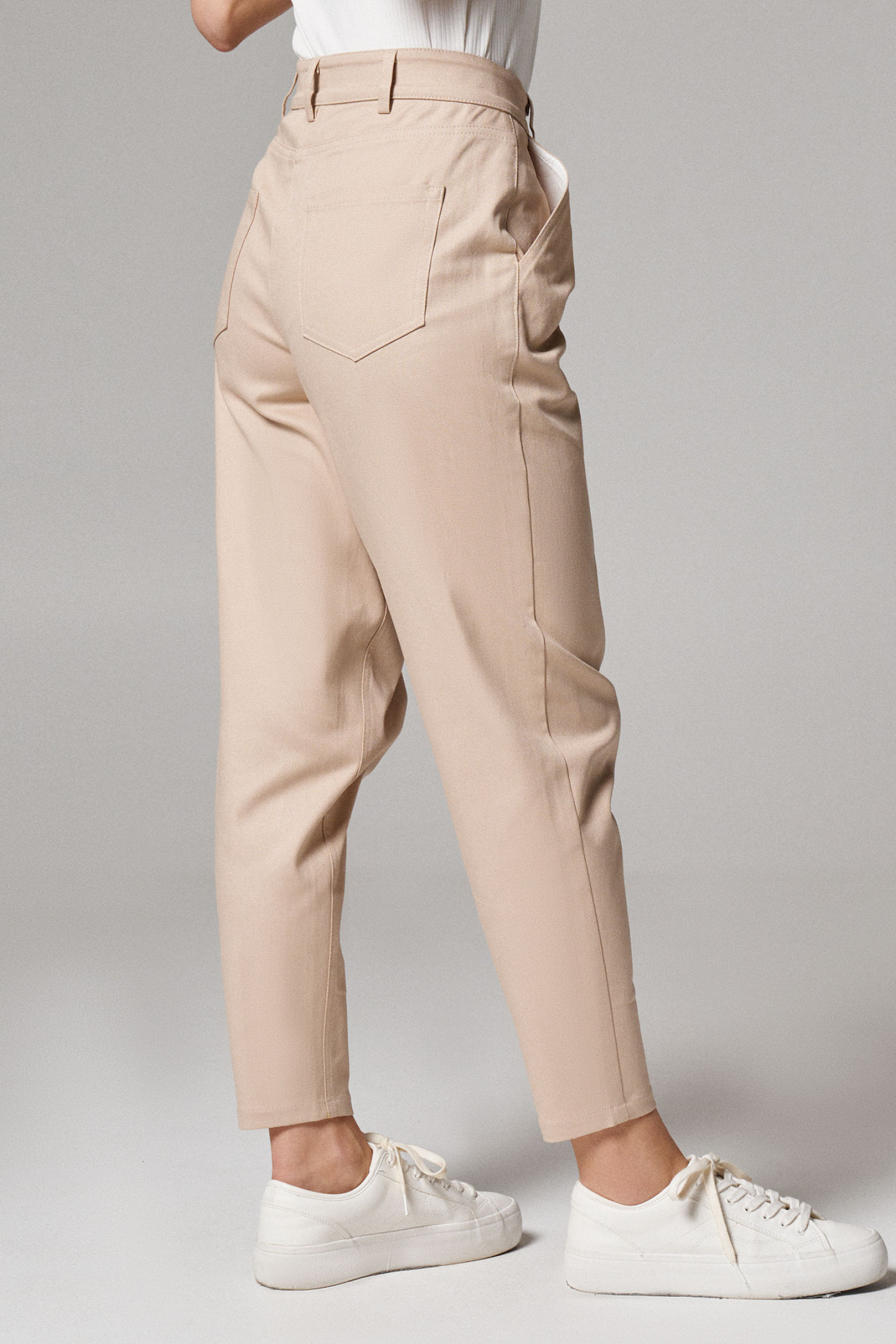 Очень модные брюки с высокой посадкой выполнены из плотной хлопковой ткани. По талии выполнен отрезной пояс со шлёвками для ремня. Застёжка спереди на молнию с гульфиком и петлю-пуговицу на поясе. От верхнего среза к боковым швам выполнены входы во внутренние карманы и две односторонние складки. По спинке выполнена отрезная кокетка и два накладных кармана. Брюки заужены книзу и укорочены. Стильные и удобные брюки на каждый день для яркой девушки.