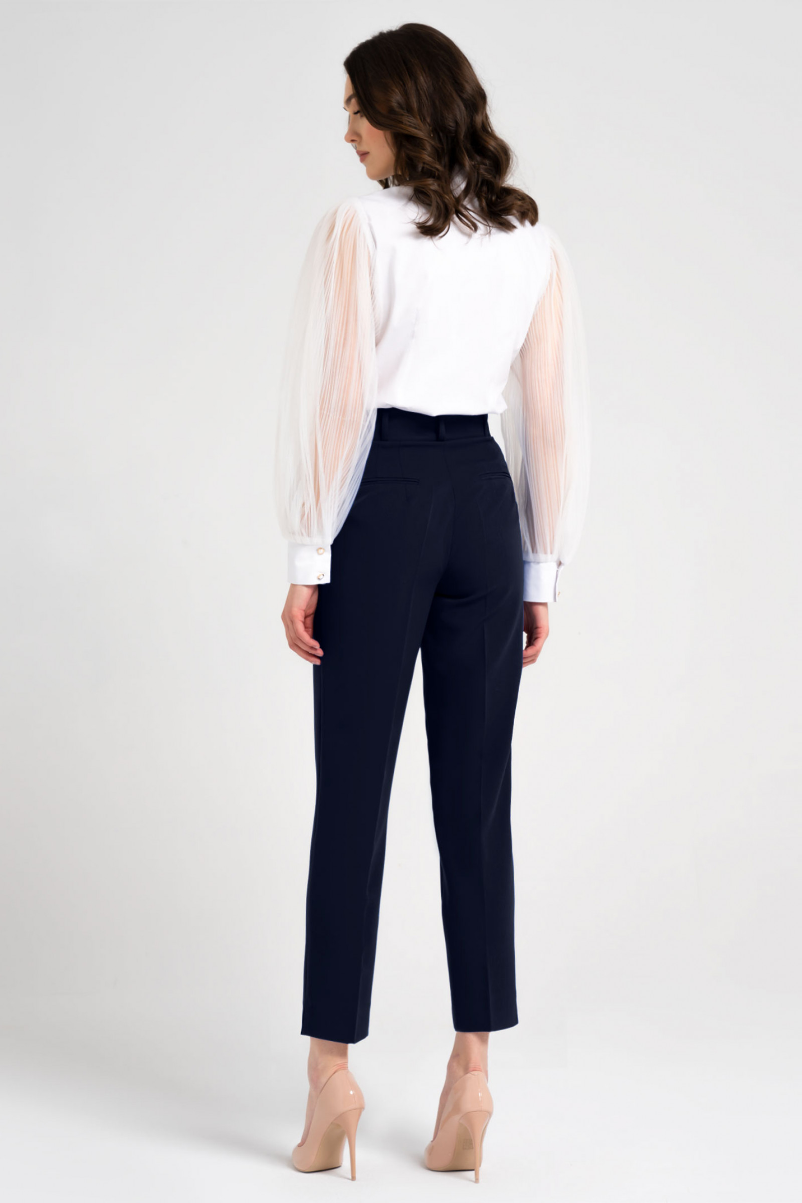 Стильные молодежные брюки с высокой посадкой на талии. Брюки заужены к низу, по низу по бокам разрезы. По переду от пояса имеются складочки. По бокам карманы. Брюки дополнены широким поясом с обтяжной пряжкой из основной ткани. Такие брюки отличный вариант как для офиса, так и для любого светского мероприятия.