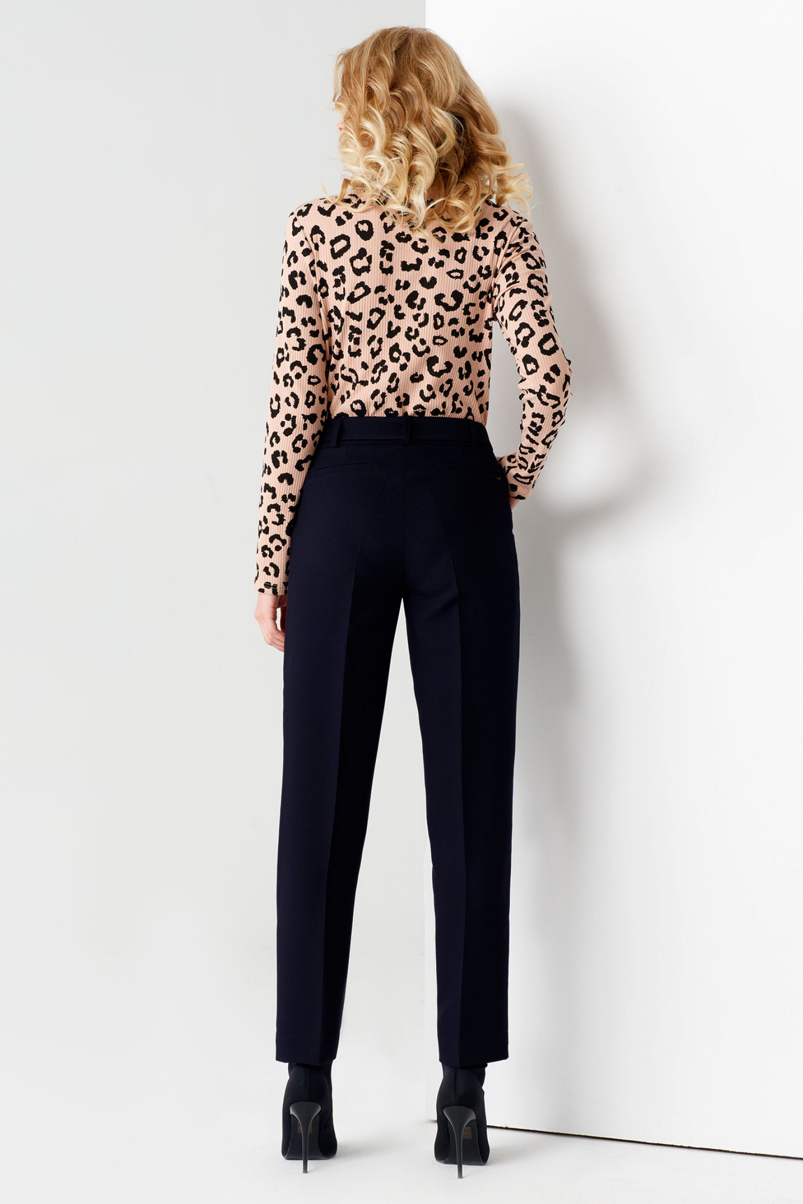 Брюки женские органично выглядят в аутфитах с пиджаком, курткой, жакетом, кардиганом. Такие комбинации помогут вам создавать привлекательные элегантные образы на каждый день в прохладное время года. Зауженные брюки безупречно садятся по фигуре, благодаря высокой посадке. Стрелки визуально удлиняют и стройнят ноги. Линия пояса – отрезная, с традиционной молнией, скрытой гульфиком и пуговицей. Трикотажные брюки дополнены боковыми прорезными карманами и поясом с пряжкой, заправленным в шлевки.