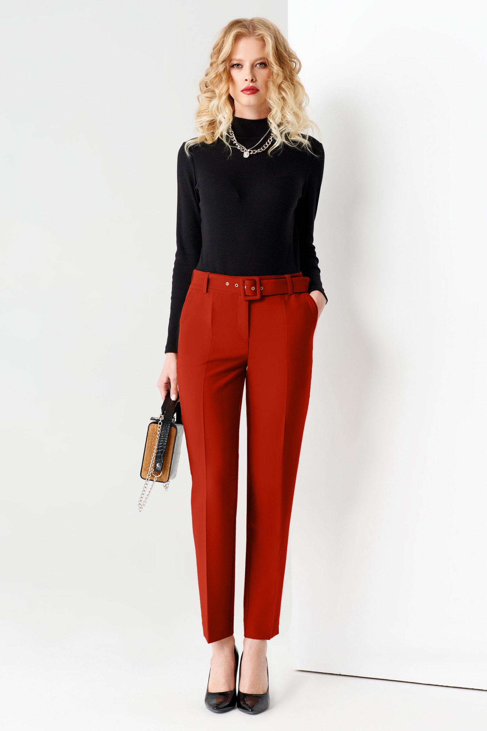 Брюки женские органично выглядят в аутфитах с пиджаком, курткой, жакетом, кардиганом. Такие комбинации помогут вам создавать привлекательные элегантные образы на каждый день в прохладное время года. Зауженные брюки безупречно садятся по фигуре, благодаря высокой посадке. Стрелки визуально удлиняют и стройнят ноги. Линия пояса – отрезная, с традиционной молнией, скрытой гульфиком и пуговицей. Трикотажные брюки дополнены боковыми прорезными карманами и поясом с пряжкой, заправленным в шлевки.