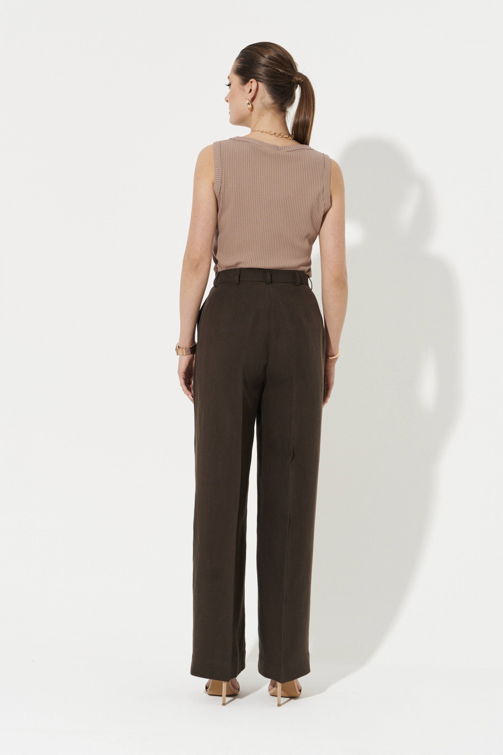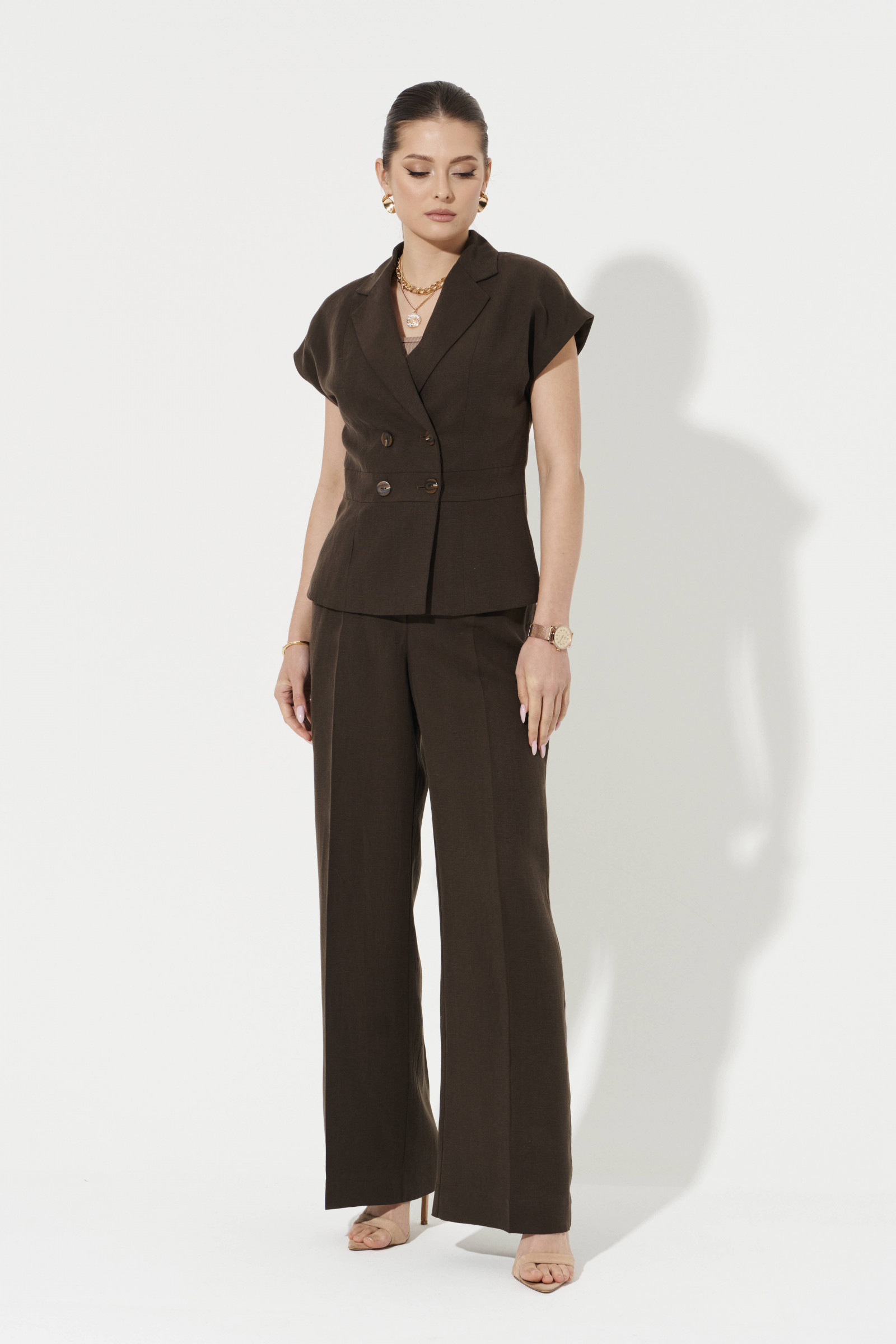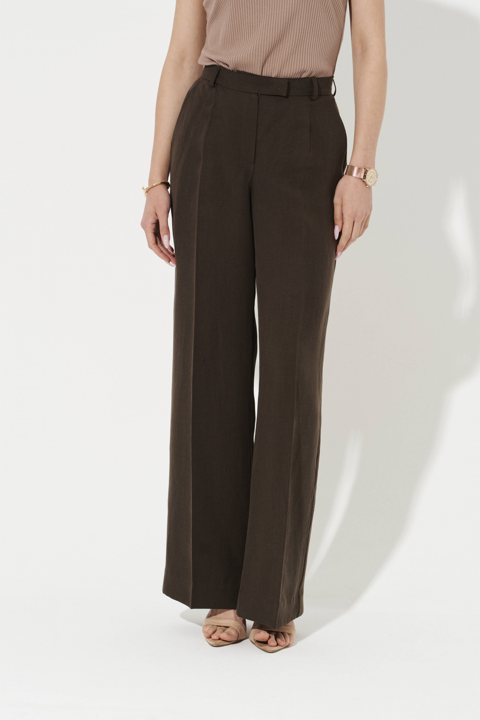 Брюки женские прямые из смесовой ткани с добавлением льна для повседневной носки. Верхний срез брюк обработан притачным поясом, застежка на один крючок, а также имеется застежка на тесьму-молнию в среднем шве брюк. Пояс брюк имеет шлевки, что дает возможность носить с ремнем. Задняя часть брюк имеет талиевые вытачки. В брюках расположен в боковом шве карман с подкройным бочком. Отличный классический вариант брюк в коричневом цвете, который станет базовой вещью в вашем гардеробе.