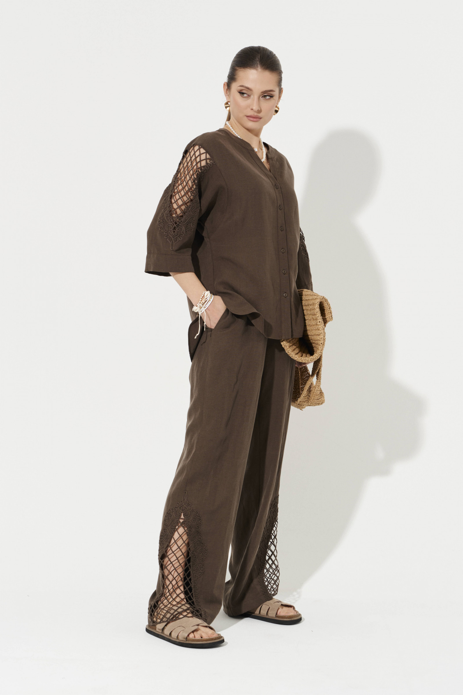 Брюки женские из смесовой ткани с добавлением льна. Брюки прямого силуэта. Верхний срез брюк обработан притачным поясом со вставкой на резинке в задней и боковой части брюк. В боковом шве имеются потайные карманы. Брюки имеют по низу изделия дизайнерскую вышивку веревкой, что добавляет им легкость и утонченность. Очень красивые брюки в коричневом оттенке, в которых вы обязательно будете стильно смотреться, а также они обязательно будут радовать вас своим стильным и удобным фасоном.