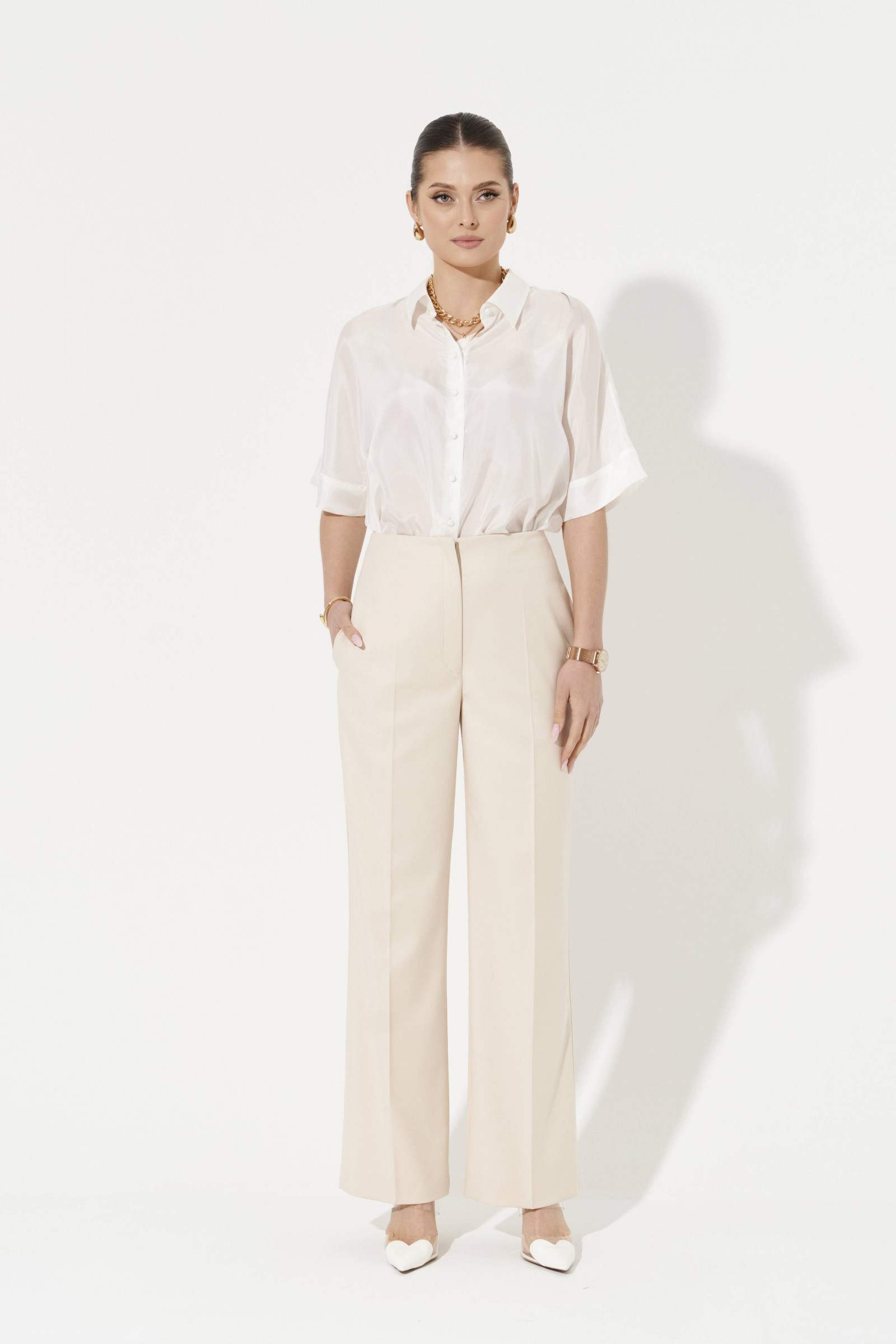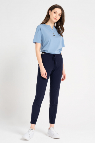 Брюки женские прямые из поливискозной ткани для повседневной носки. Верхний срез брюк обработан притачным поясом, застежка на одну потайную петлю и одну пуговицу, а также имеется застежка на тесьму-молнию в среднем шве брюк. Задняя часть брюк имеет четыре талиевые вытачки и прорезной карман в рамку с двумя обтачками. В брюках расположен в боковом шве потайной карман. Отличный классический вариант брюк, которые будут гармонично смотреться под любые изделия.