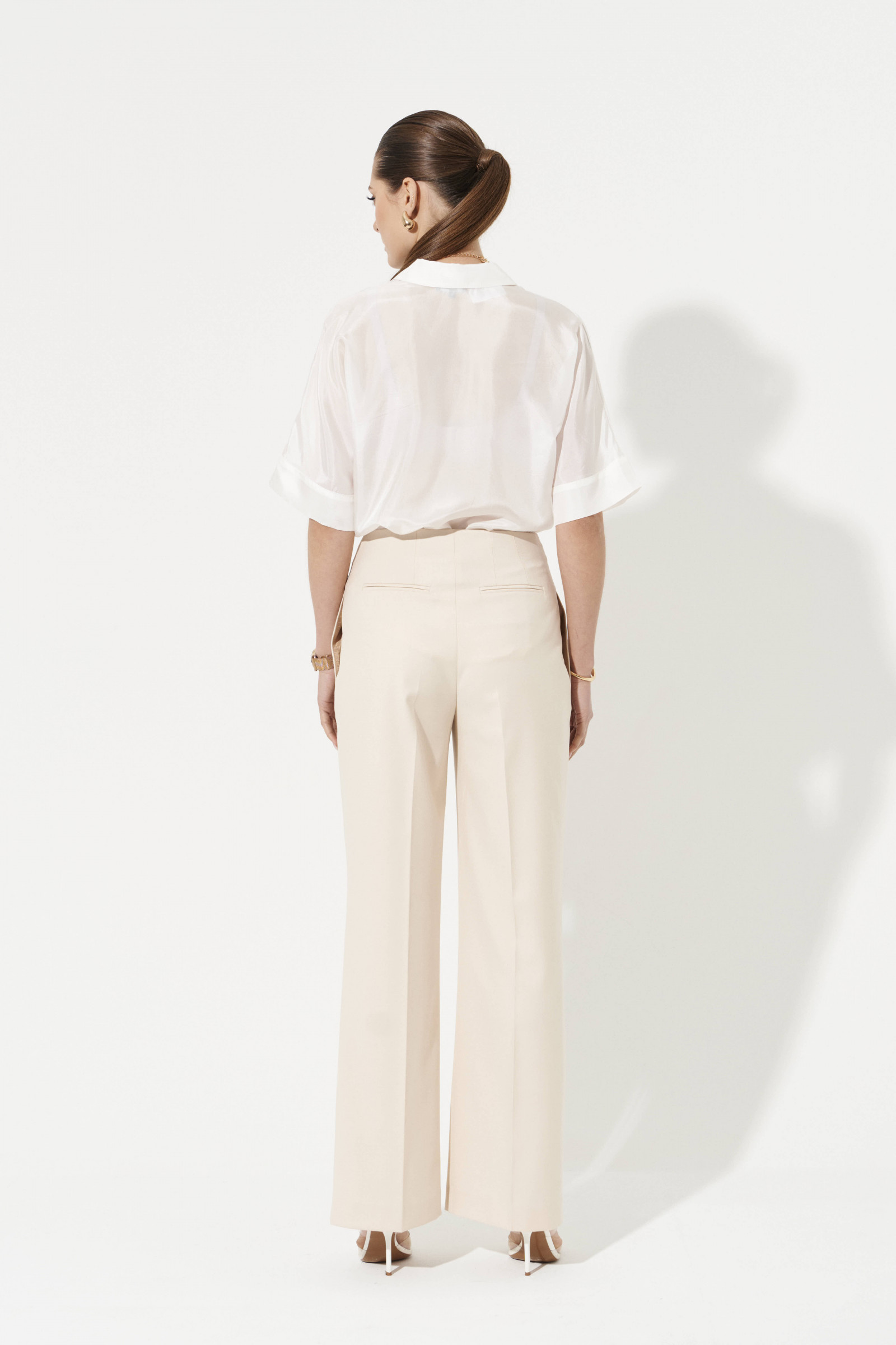 44 Брюки: Высота посадки - 30см, Длина брюк - 110см, Длина по шаговому шву - 80.5см, Ширина брючин сверху - 62см, Обхват брюк по низу - 51см, Ширина по бедрам - 51.5см, Ширина по талии - 35.5см;