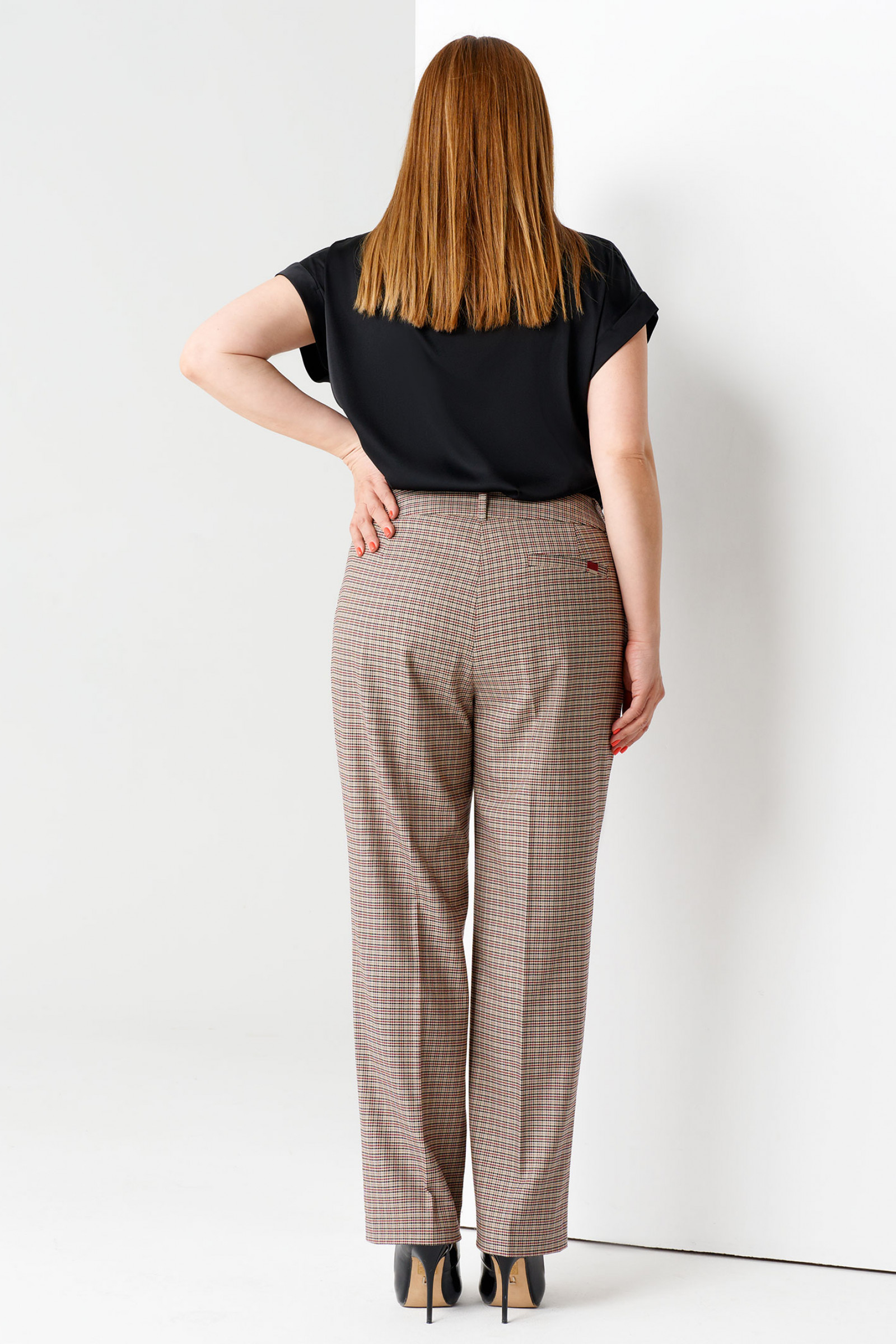 Лаконичное изделие изготовлено из мягкой плотной поливискозной ткани в клетку, устойчивой к активной носке, частой стирке. Брюки женские больших размеров отличаются аккуратными линиями кроя, ровными прочными швами, минималистичным дизайном. Отрезной пояс с петлей пуговицы дополнен шлевками для ремня, застежка-молния скрыта гульфиком.