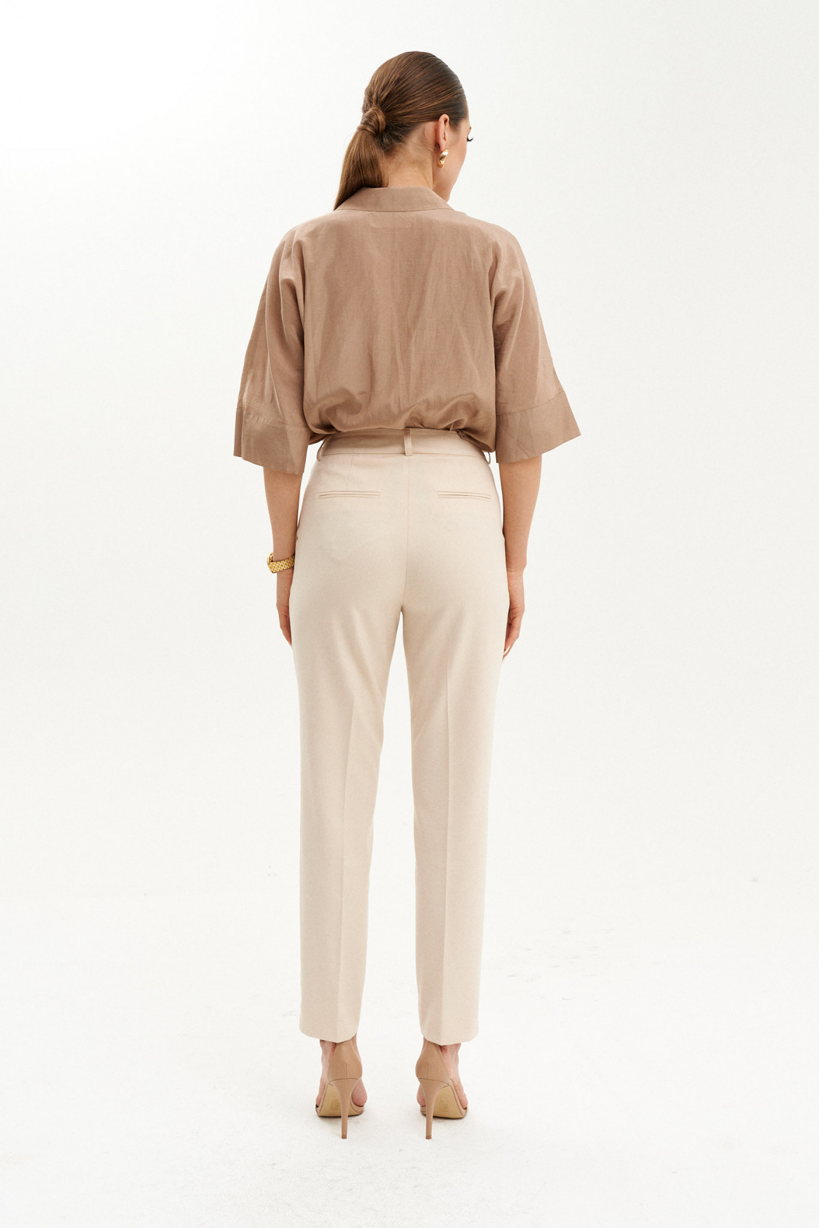 Брюки на поясе с молнией, заужены к низу. Дополнение: укороченные, снизу по бокам брючин выполнены небольшие разрезы, на задней части – прорезные карманы в рамку, есть боковые карманы.
