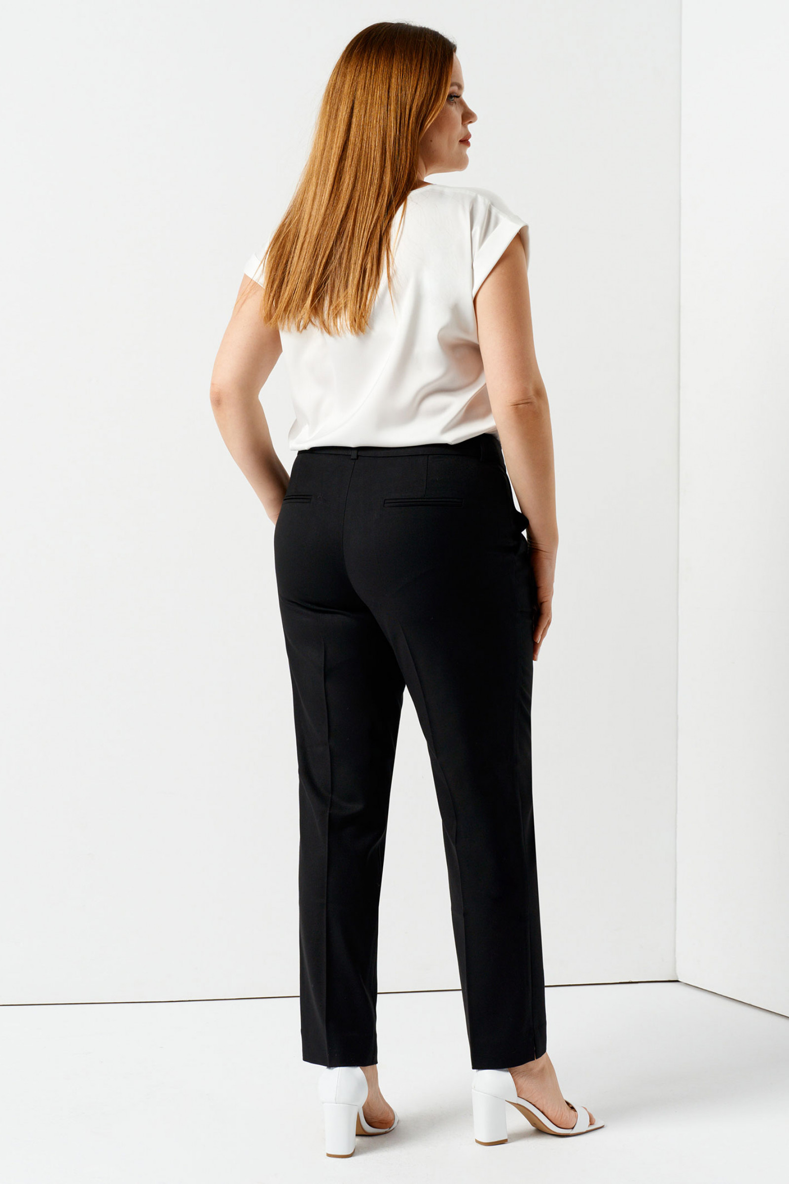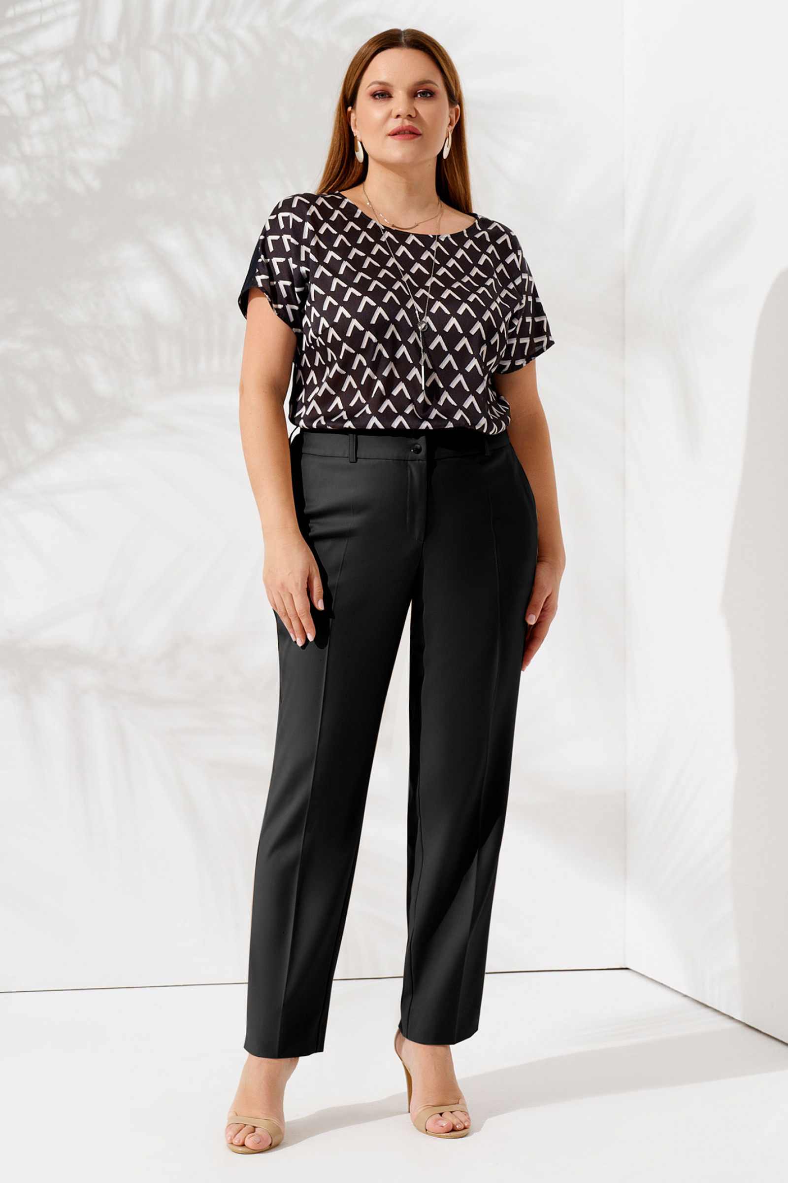 Женские брюки большого размера не выглядят громоздкими, благодаря особенностям кроя. Свободные в верхней части и чуть зауженные к низу, они визуально стройнят ноги и увеличивают рост. На поясе расположены шлевки для ремня и две пуговицы. Застежка-молния – в гульфике.