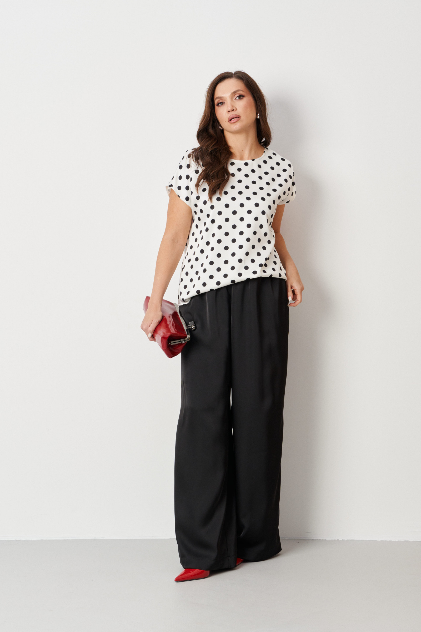 Женские брюки из струящейся ткани выполнены в классическом прямом крое. Верхний срез аккуратно обработан притачным поясом со вставкой на резинке, обеспечивающей комфортную посадку. В боковых швах расположены потайные карманы, что делает модель практичной и удобной в повседневной носке. Этот элегантный и функциональный элемент гардероба отлично впишется в повседневные образы, сочетая стиль и комфорт.