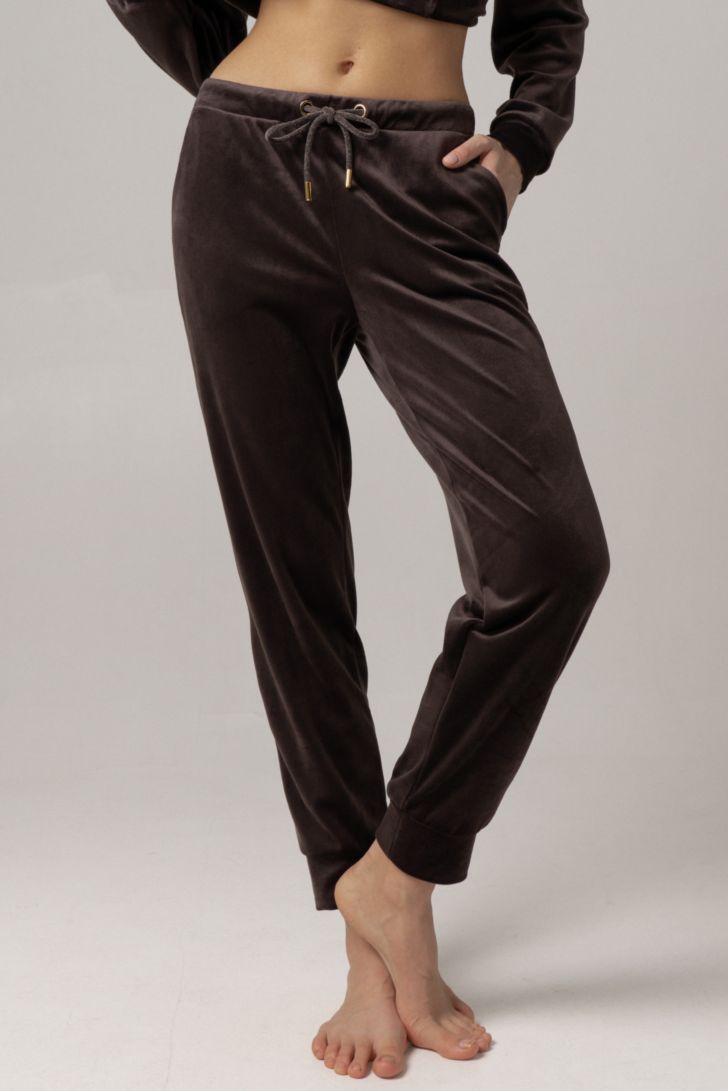 Брюки свободного прилегания, зауженные к низу. Мягкий пояс на кулисе. Пояс декорирован люверсами и бархатным шнуром с металлическими наконечниками.