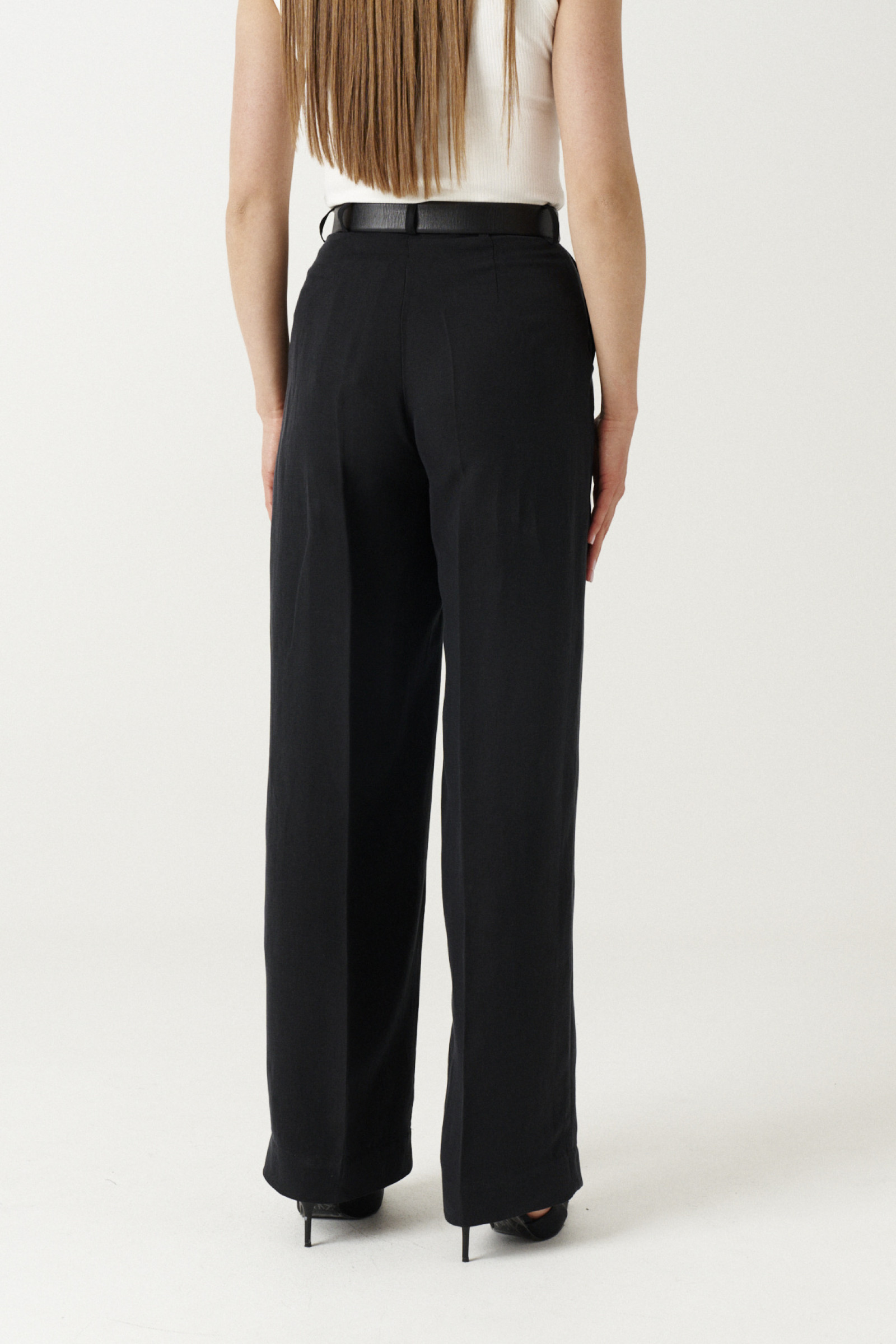 54 Брюки: Высота посадки - 31см, Длина брюк без пояса - 112см, Длина по внутреннему шву - 83.5см, Ширина брючин сверху - 79см, Обхват брюк по низу - 66см, Ширина по бедрам - 59.5см, Ширина по талии - 47см;