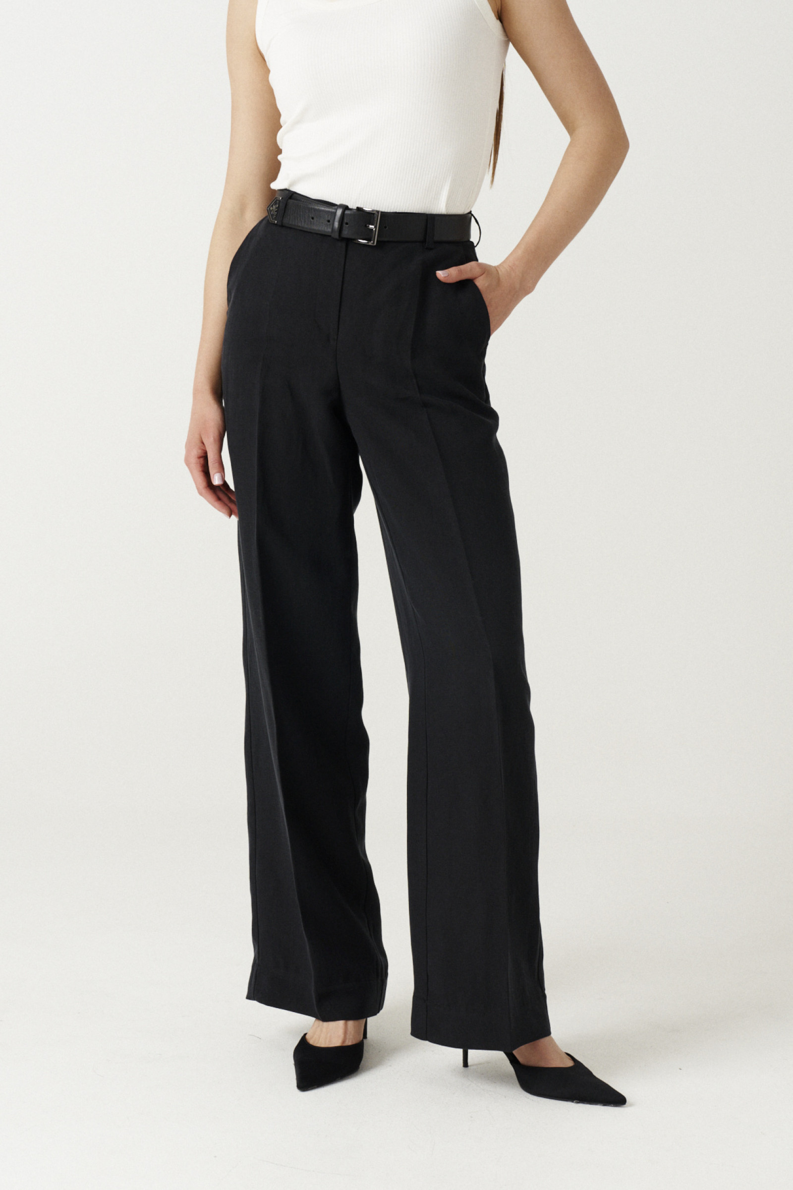 44 Брюки: Высота посадки - 28.5см, Длина брюк без пояса - 111см, Длина по внутреннему шву - 83.5см, Ширина брючин сверху - 68.5см, Обхват брюк по низу - 59см, Ширина по бедрам - 49.5см, Ширина по талии - 35.5см;