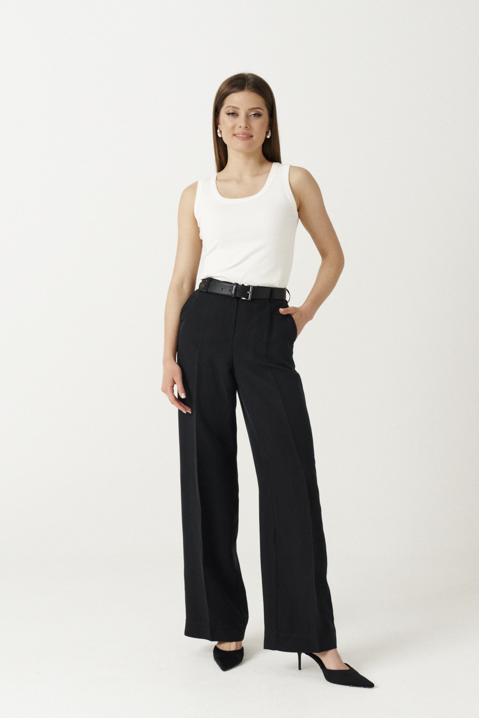 Прямые широкие брюки – удобная одежда, повседневной носки и особых случаев. Стильные брюки для прямые по силуэту. Пояс, дополненном резинкой, что очень удобно. В области боковых швов располагаются прорезные карманы. Боковая линия слегка смещена. Отлично сочетается с блузками, футболками, топами, майками, жакетами. Данные брюки пошиты из льняной ткани. Льняная ткань обладает гигроскопичностью, воздухопроницаемостью и подойдёт для жарких дней. Заказывайте летние брюки больших размеров, чтобы пополнить свой сезонный гардероб практичной вещью.