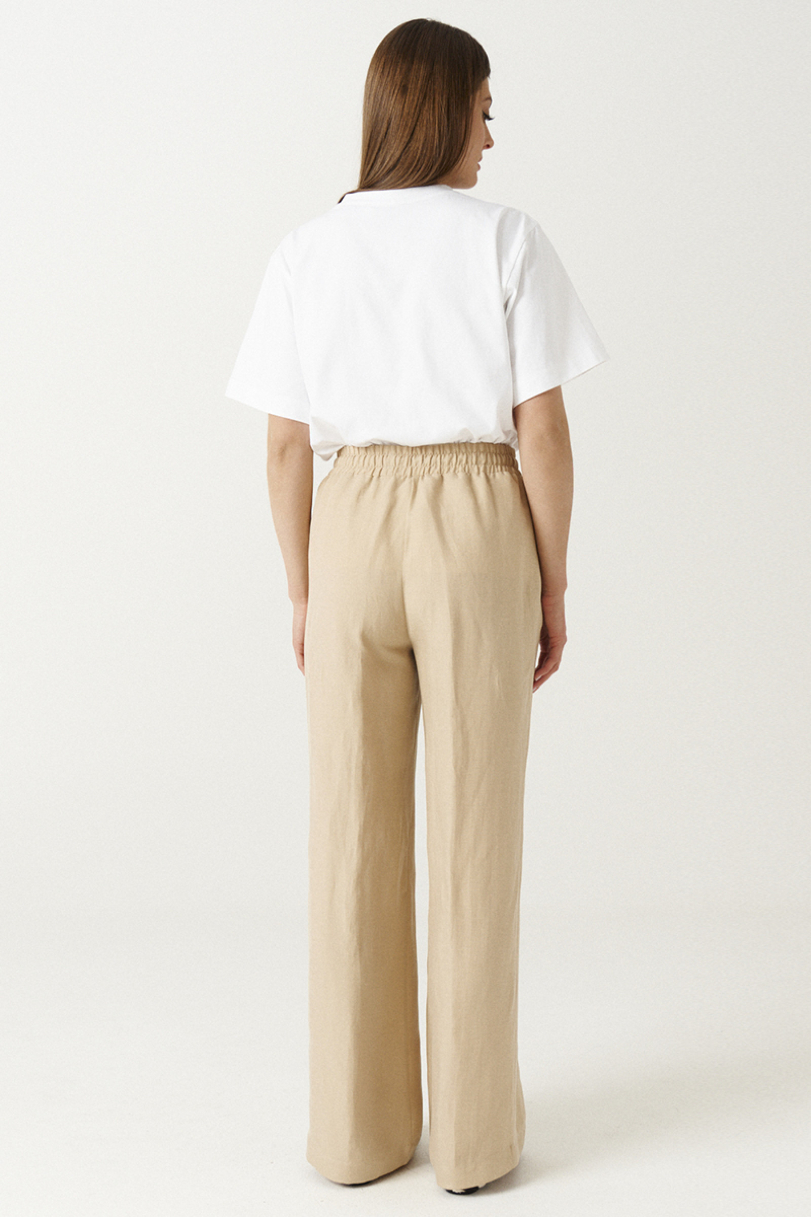 Брюки прямого кроя на резинке выполнены из льняной ткани. Характеристики: Прямой крой, прорезные карманы в боковых швах. Длина классическая.
