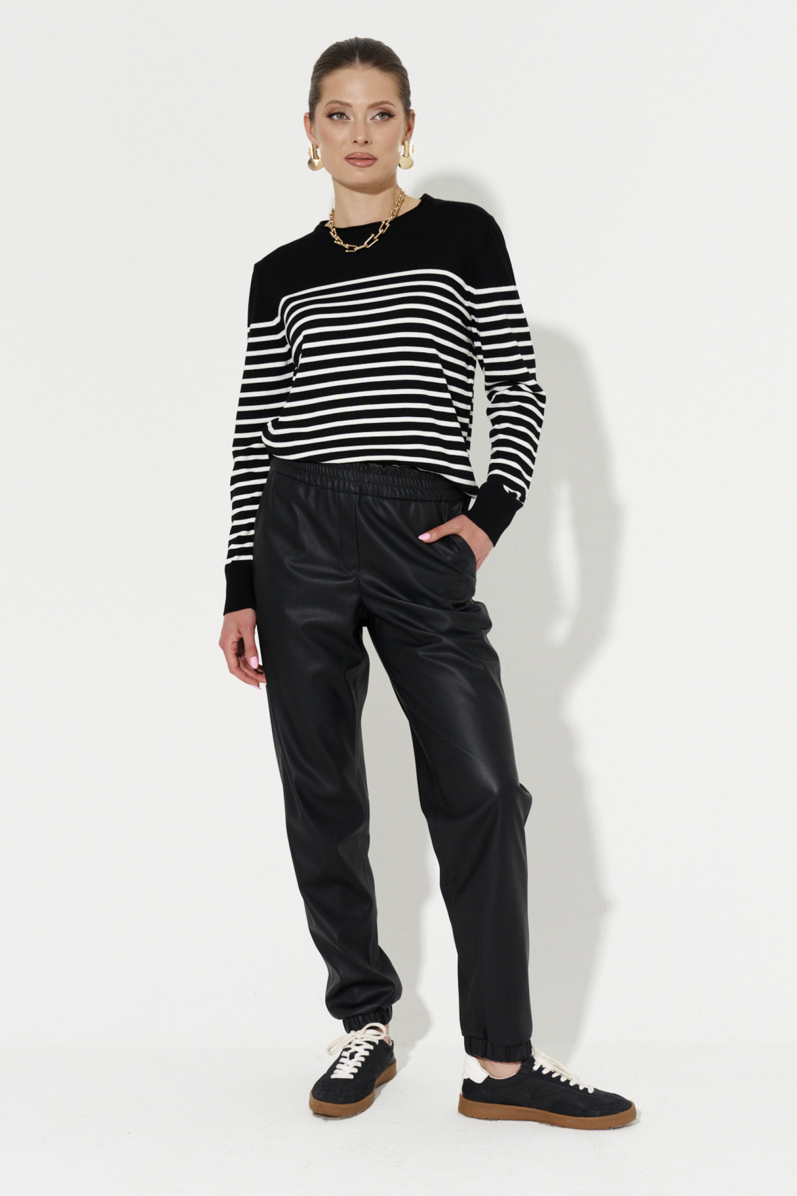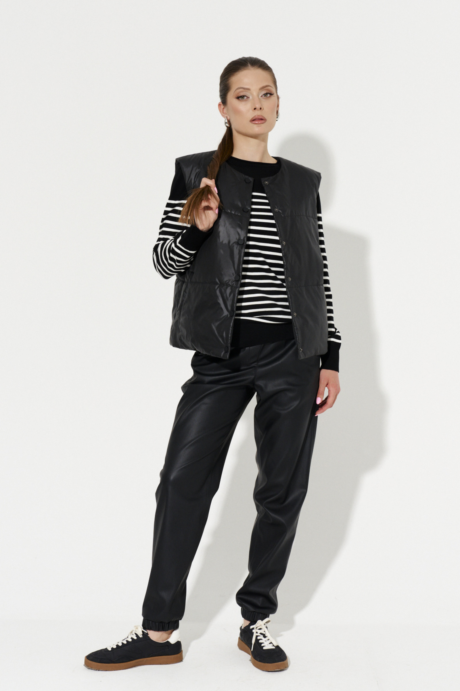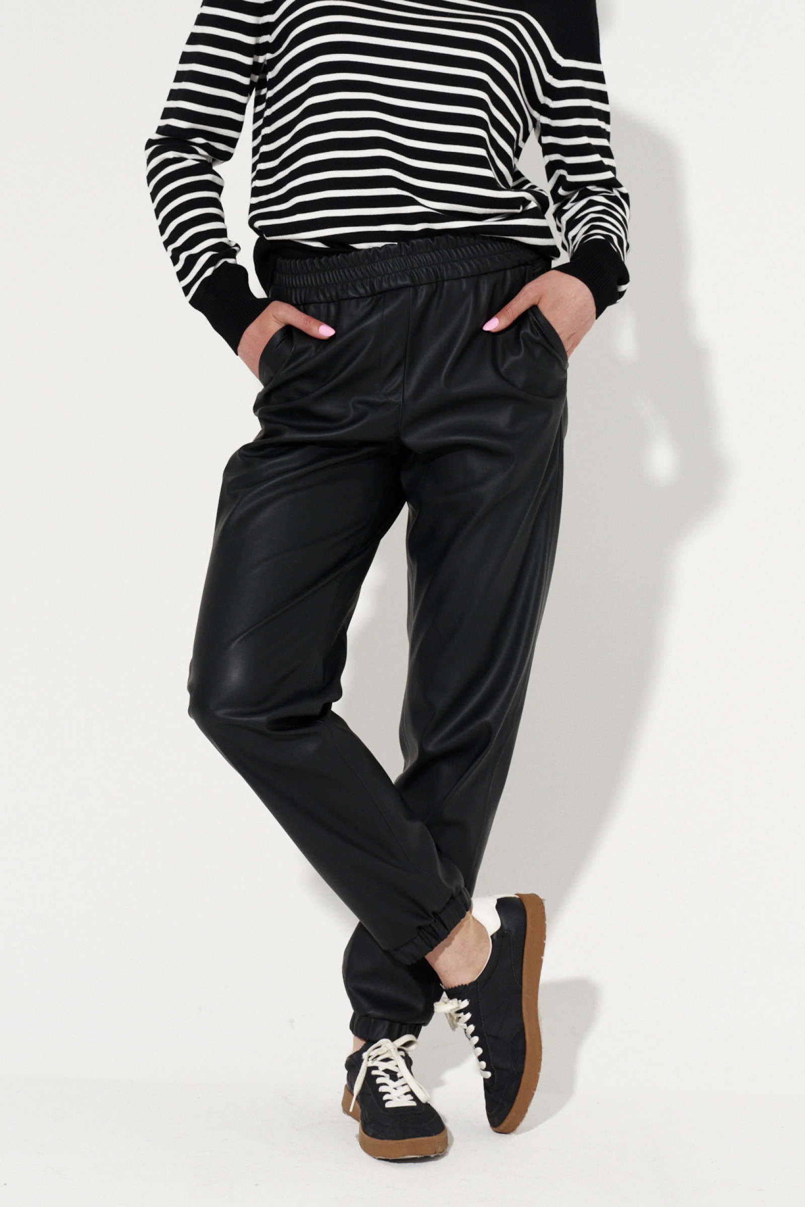 Брюки женские прямые из смесовой ткани, из эко кожи для повседневной носки. Верхний срез брюк обработан притачным поясом на резинке. Низ брюк обработан притачной манжетой на резинке. Брюки имеют боковой прорезной карман в шве с подкройным бочком. Удобные и очень модные брюки, которые отлично будут смотреться на любой фигуре.