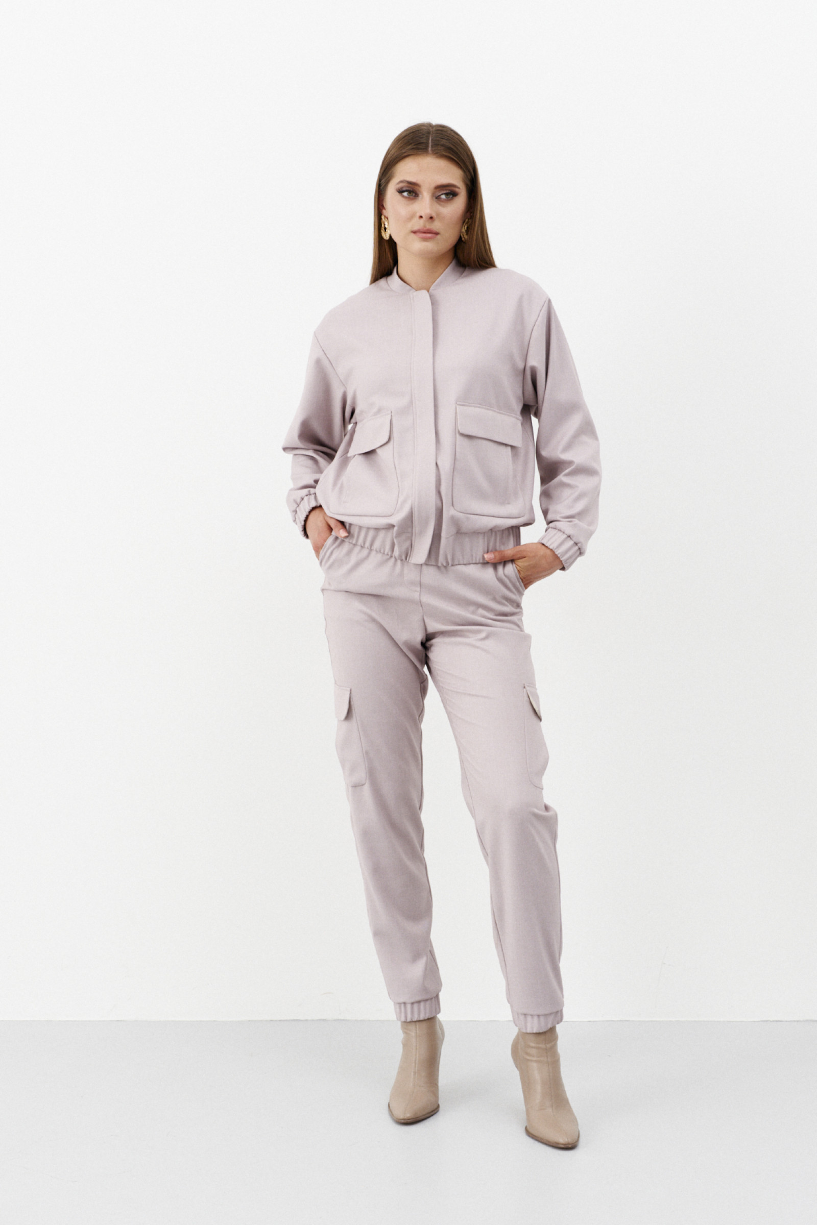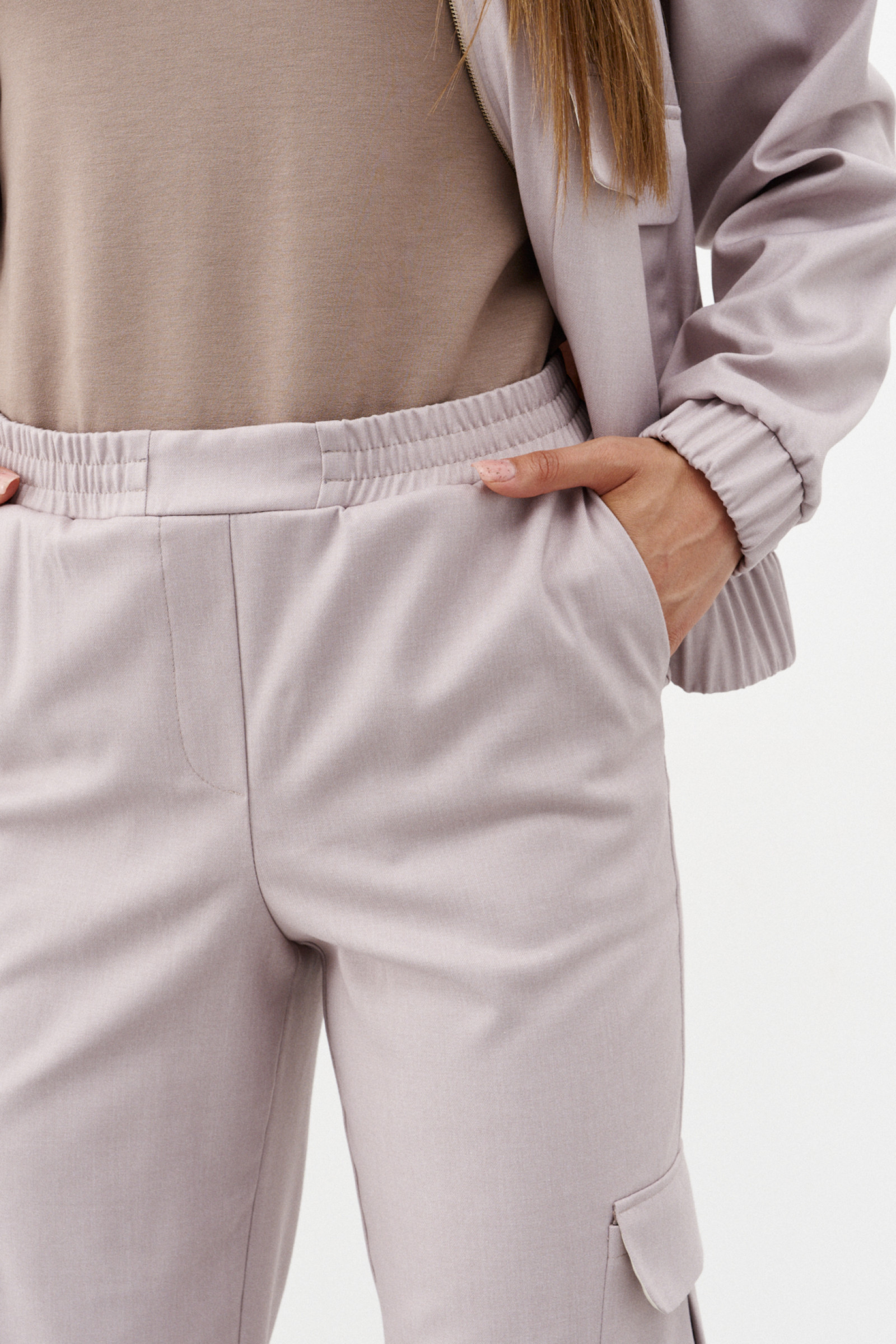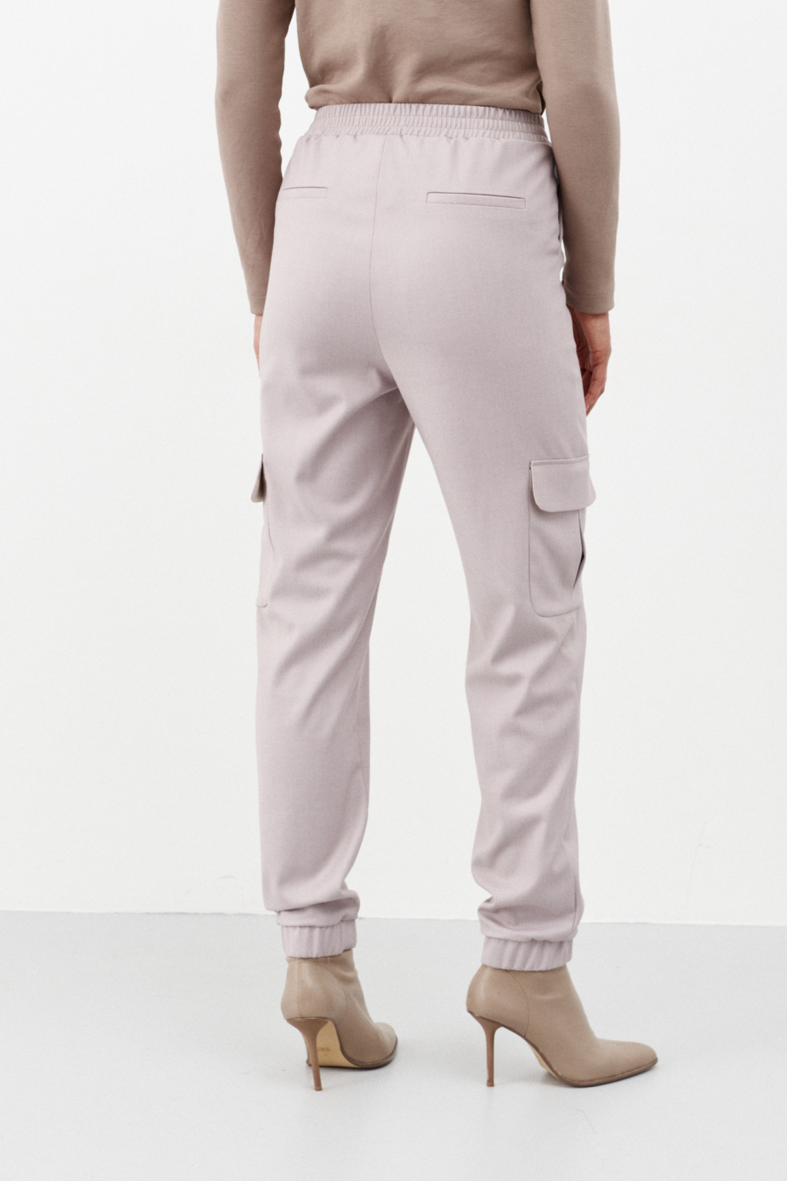 Брюки с поясом на резинке. По бокам выполнены накладные карманы с клапаном. По низу брючин – манжеты на резинке.