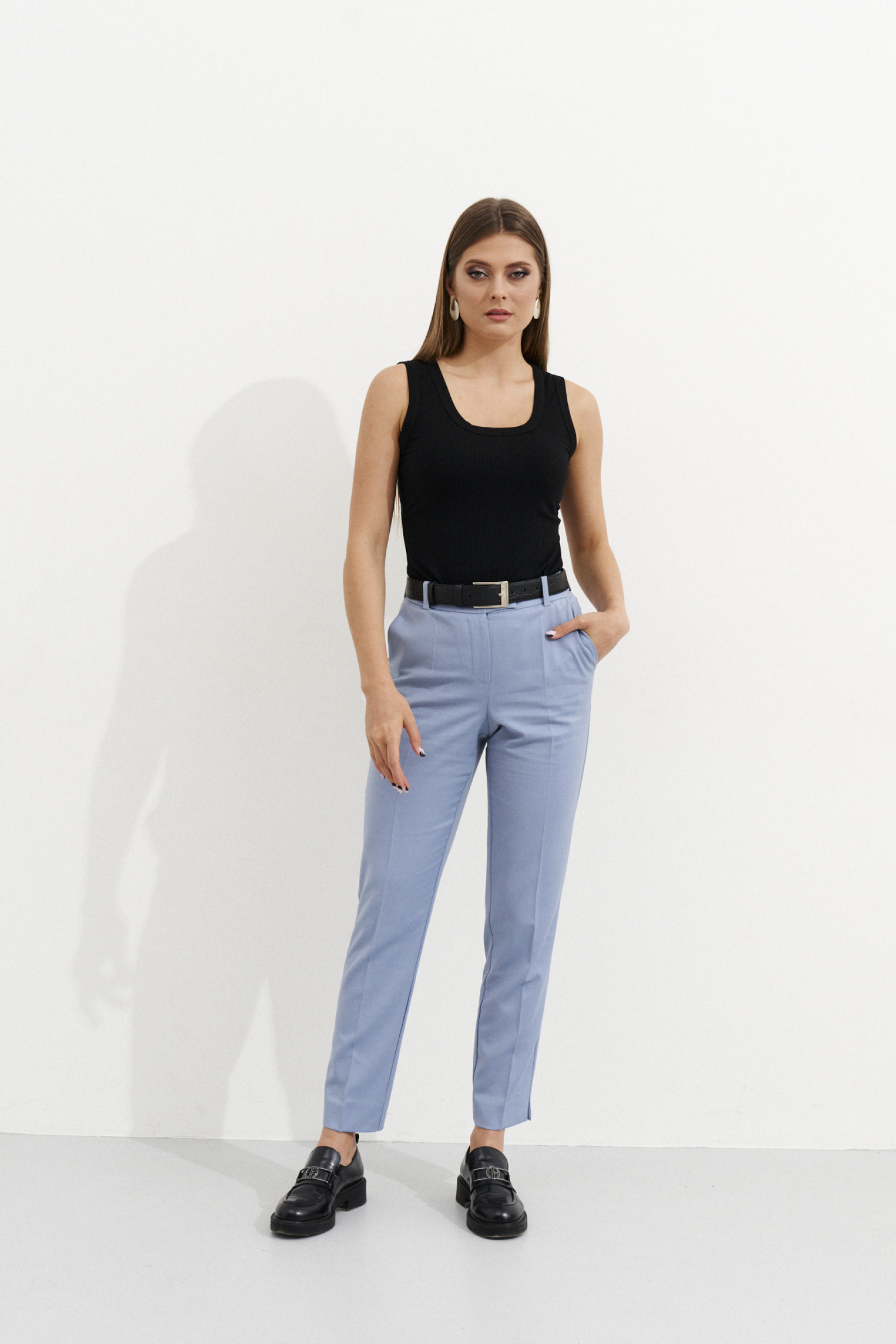 Брюки женские из поливискозной ткани для повседневной носки. Брюки чуть заужены к низу. Верхний срез брюк обработан притачным поясом с застежкой на одну обметанную петлю и одну пуговицу, так же имеется застежка на тесьму молнию в среднем шве брюк. В брюках имеются шлевки, что дает возможность носить их по ремень. Задняя часть брюк имеет две талиевые вытачки и два прорезных кармана в рамку с двумя обтачками. В боковом шве имеется карман с подкройным бочком. Стильные брючки, которые отлично будут подходить и сидеть на любой фигуре. В данных брюках вы будете очаровывать всех своим прекрасным видом.