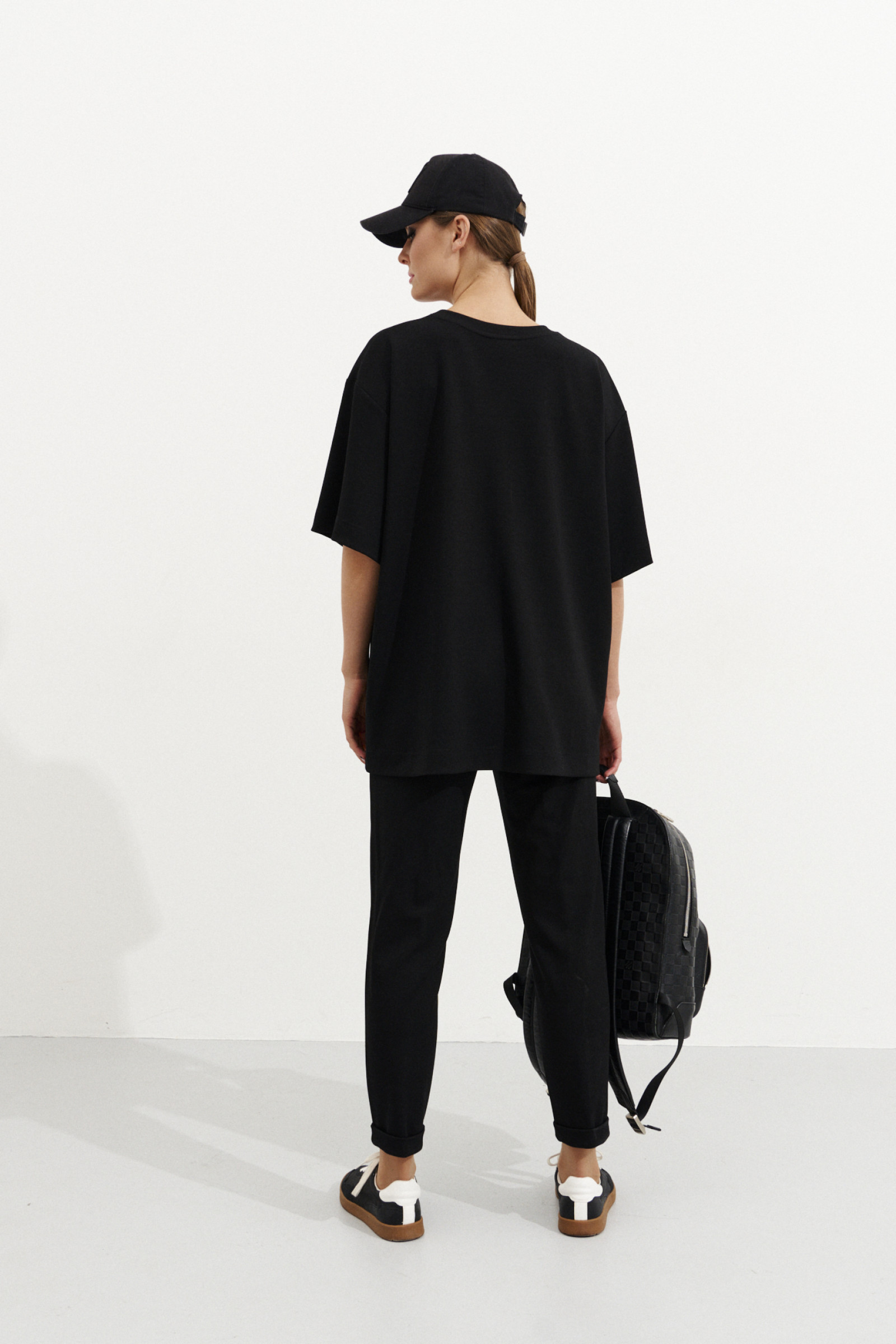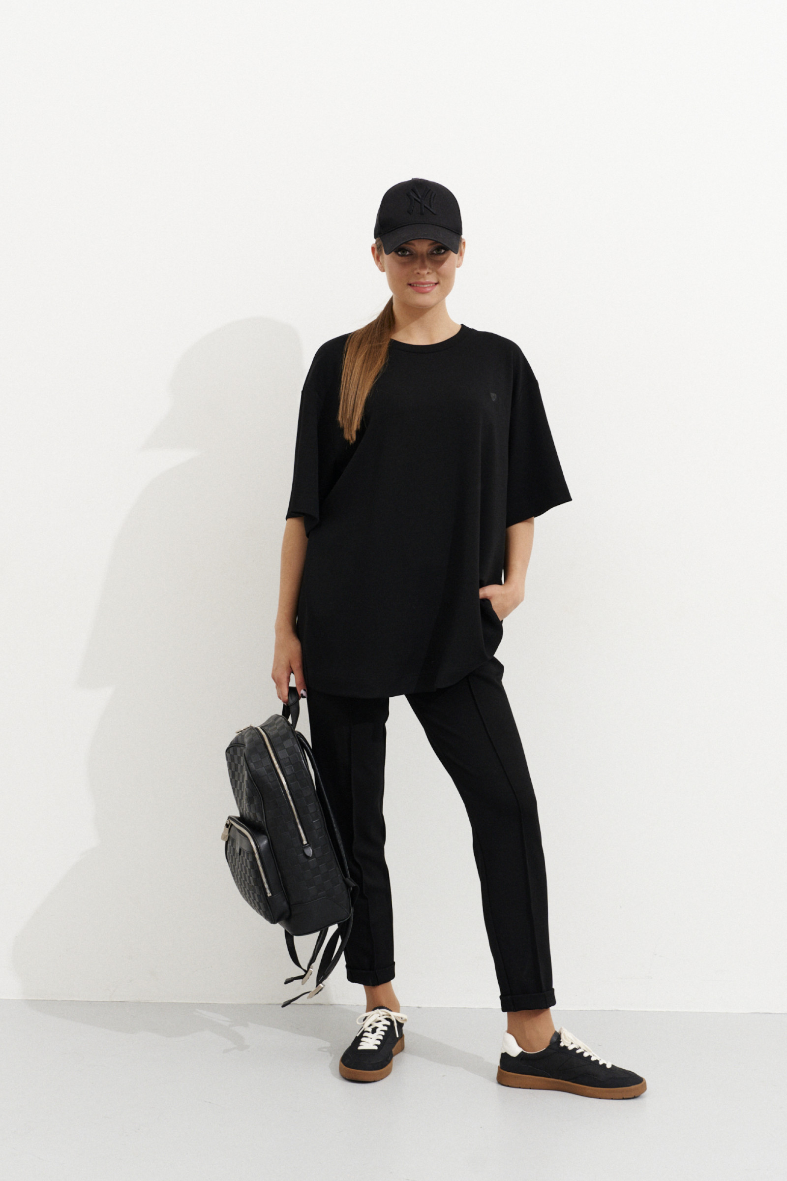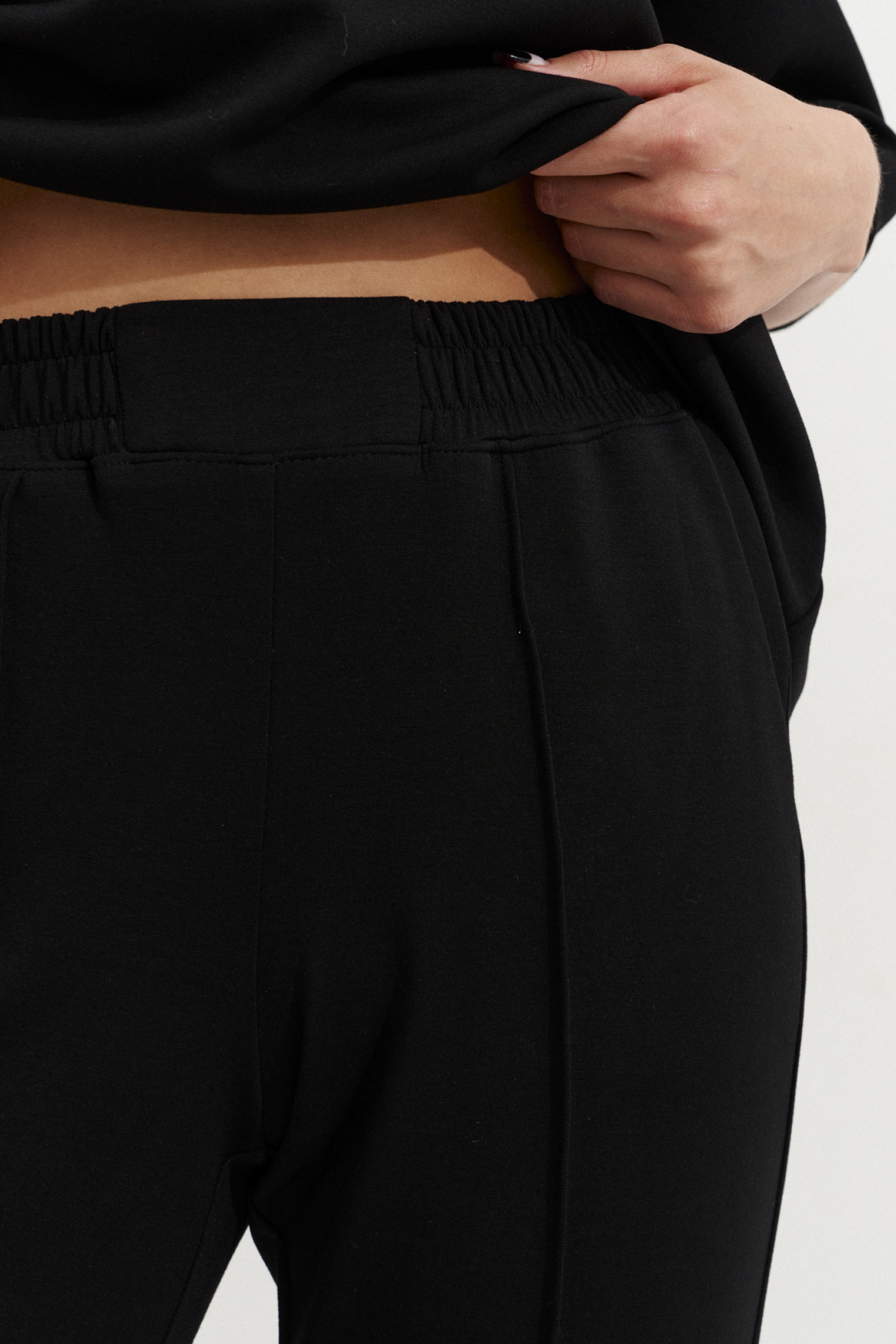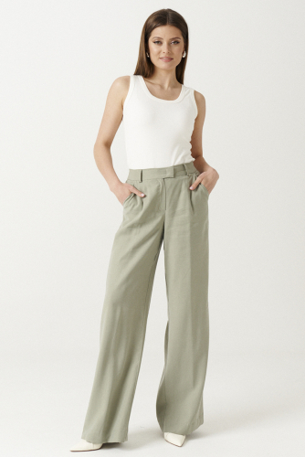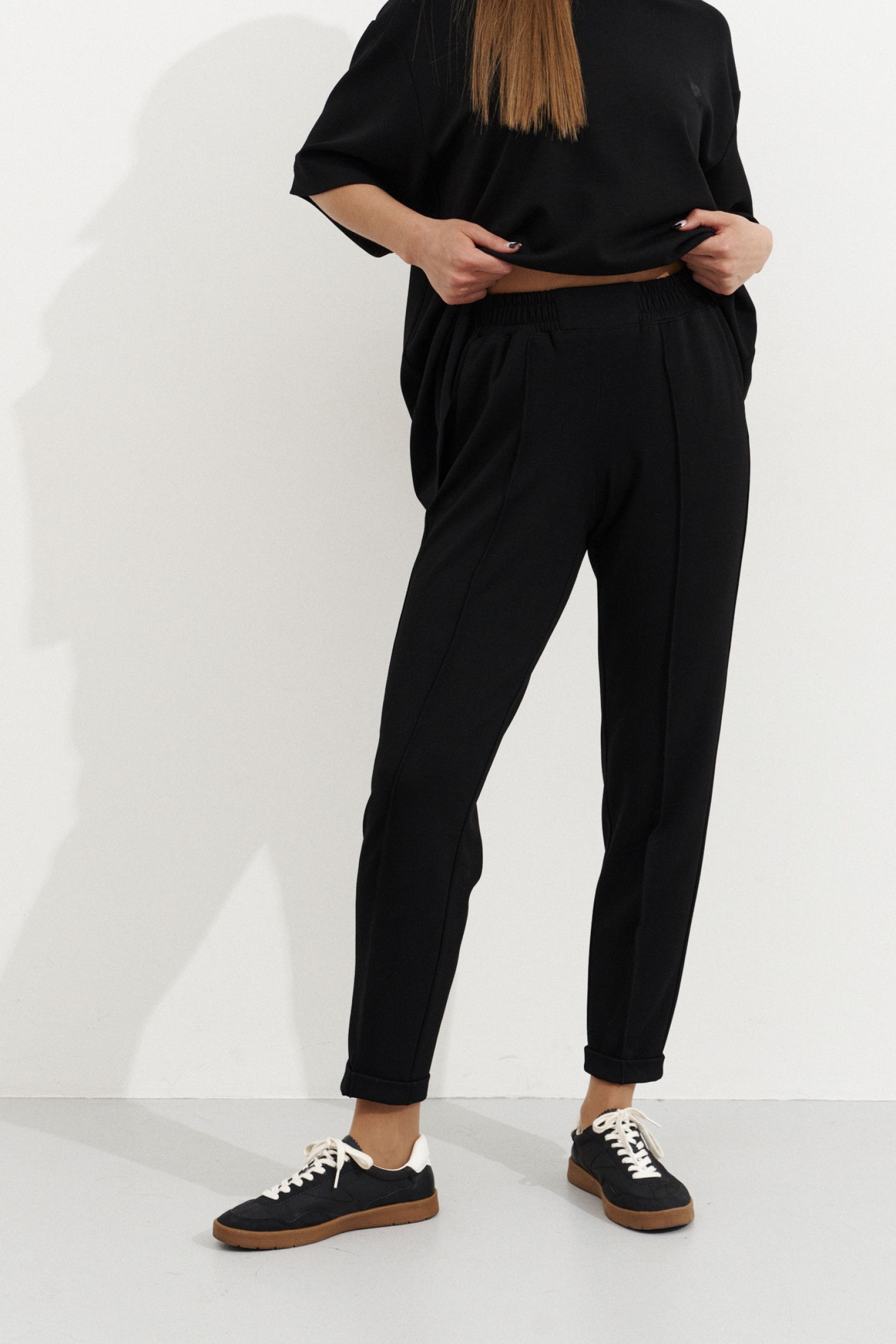 Брюки женские для повседневной носки из смесовой трикотажной ткани. Брюки прямые, верхний срез брюк обработан притачным поясом на резинке. На передней части брюк имитация рельефов, выходящих из пояса и доходящих до низа изделия. В брюках располагается боковой прорезной карман в шве. Задняя часть брюк имеет кокетку. Низ брюк с заворотами. Это идеальная модель для тех, кто давно ищет подходящие брюки со стильной конструкцией.