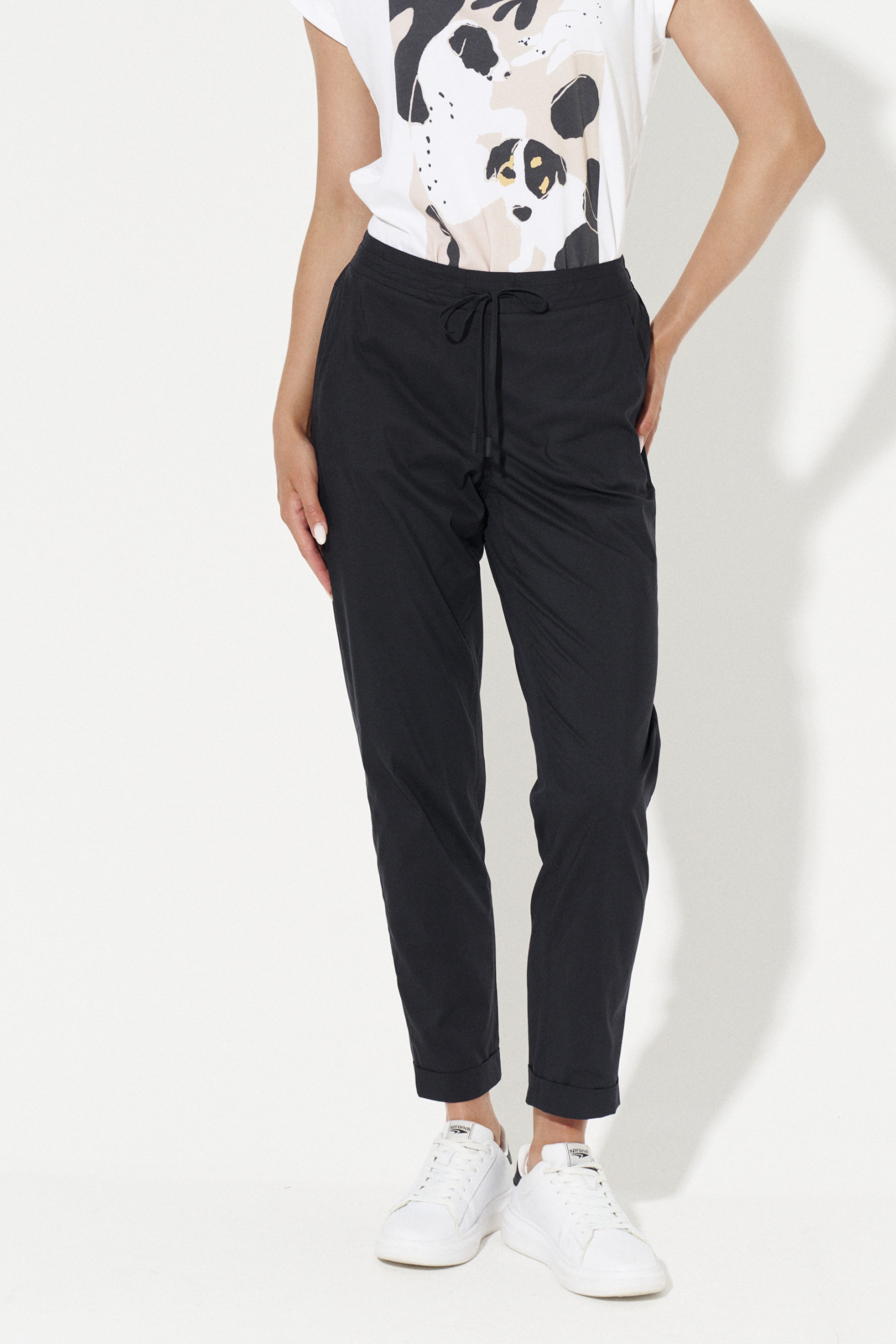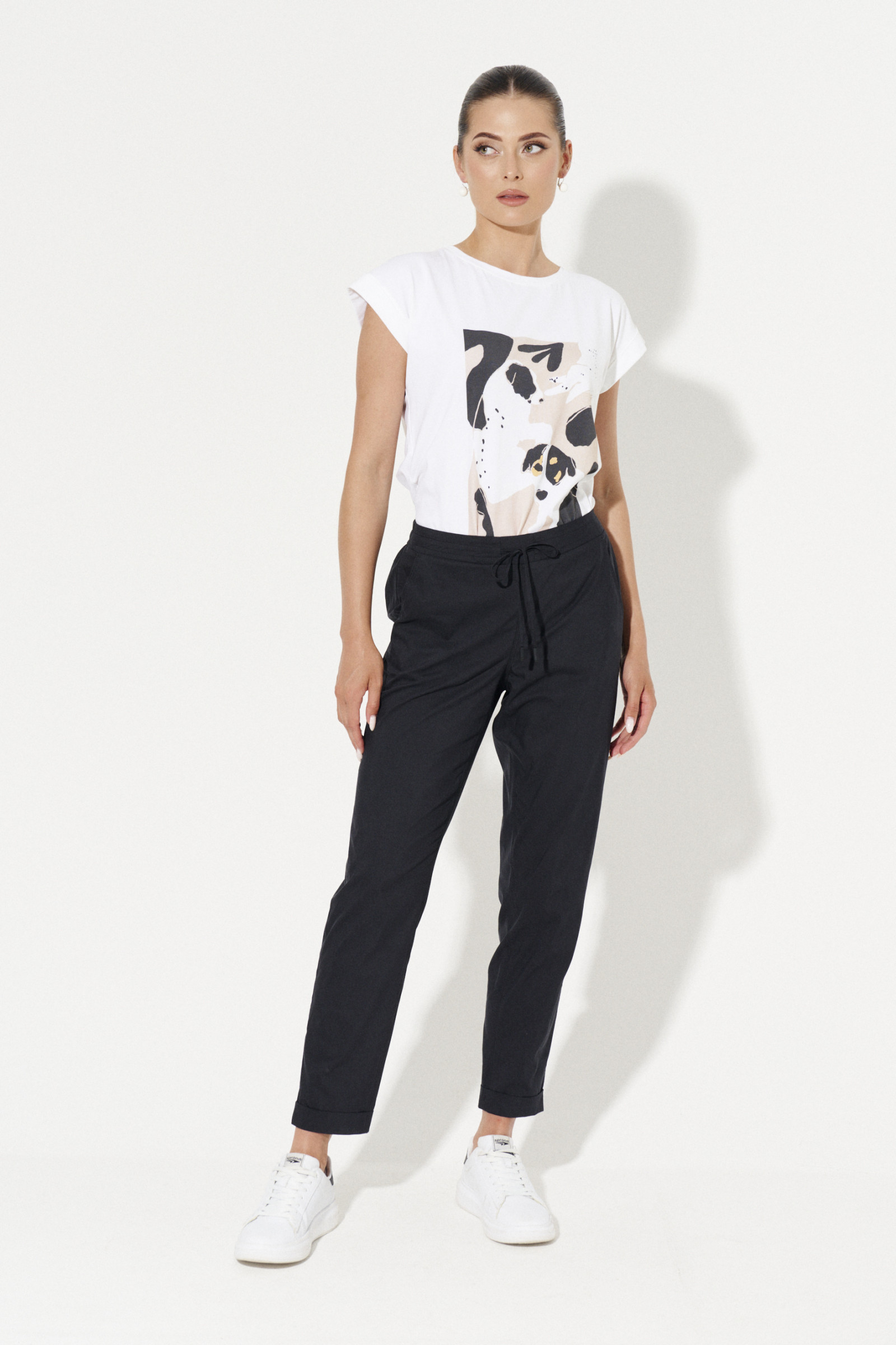 Женские брюки на резинке - это модный и удобный выбор для вашего летнего гардероба! Их крой обеспечивает свободу движений, Брюки слегка зауженные к низу. Пояс отрезной, а резинка по спинке на поясе делает их комфортными для носки. По передней части пояса кулиса со шнурком из основной ткани. К тому же, в боковых швах предусмотрены карманы, что позволит вам хранить необходимые мелочи под рукой. По задним половинками отрезные кокетки и имитация прорезных карманов. По низу отложная манжета