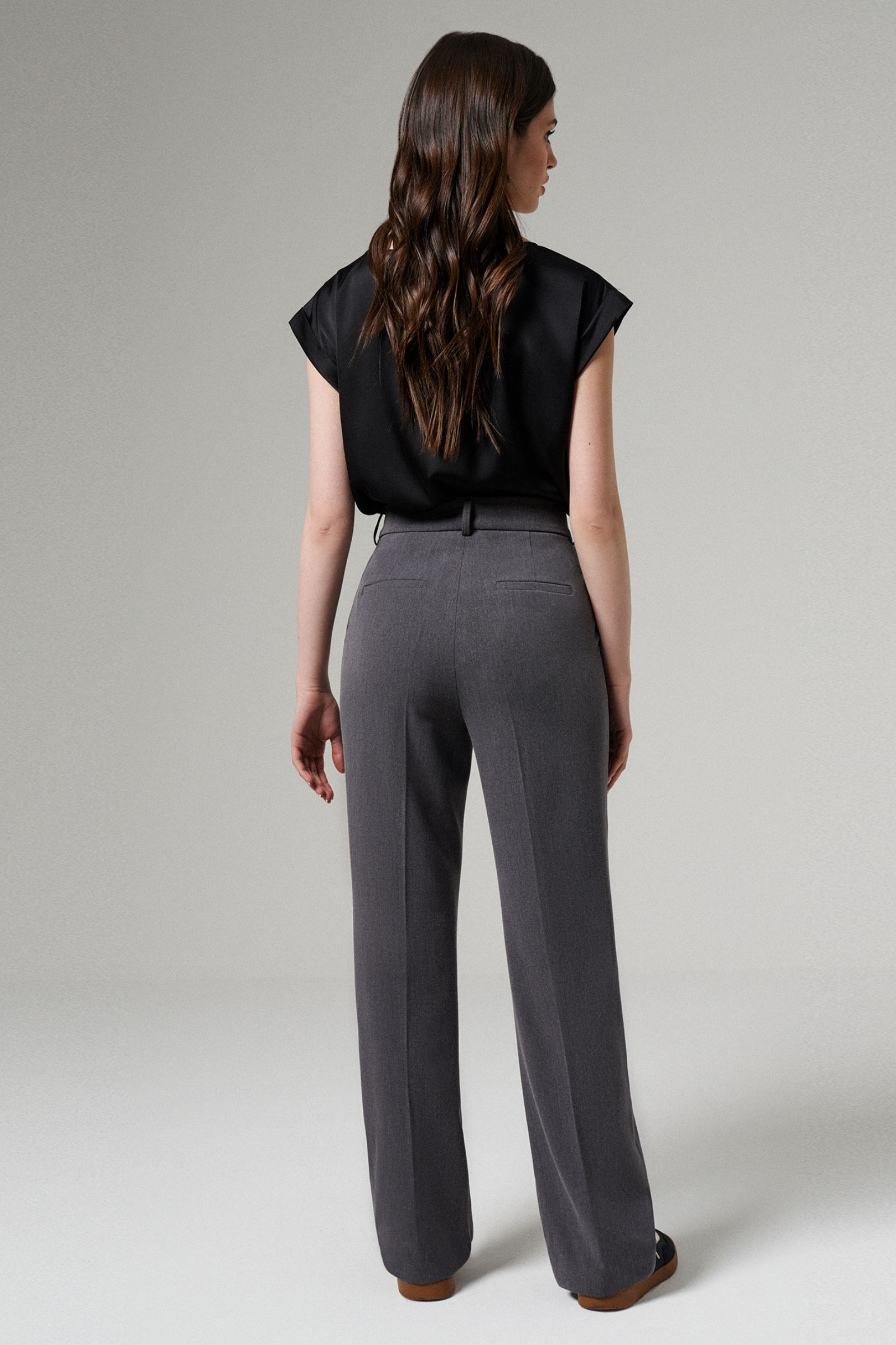 Брюки женские из поливискозной ткани для повседневной носки. Брюки прямые, слегка зауженные. На передней части брюк есть боковые карманы.Верх брюк обработан отрезным поясом, застёгивающийся на тесьму-молнию и потайной крючок. На задней части брюк есть талиевые вытаки и прорезные карманы. Ткань однотонная.