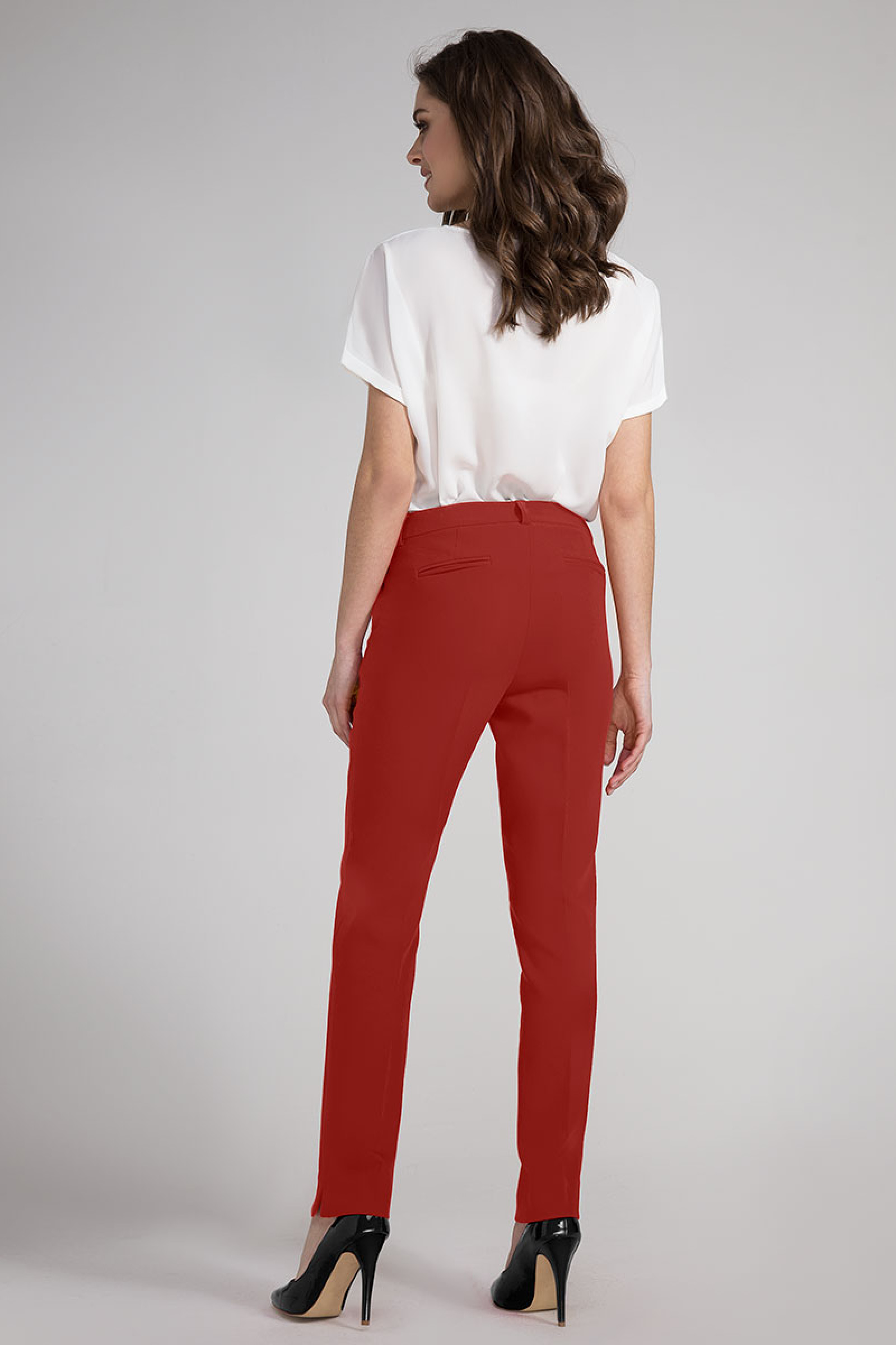 Брюки женские, зауженные к низу, дополнены карманами в боковых швах и их имитацией в задней части изделия. По бокам штанин - небольшие разрезы. Брюки женские зауженные застегиваются на молнию. На поясе располагается потайной крючок-застежка и шлевки для ремня.