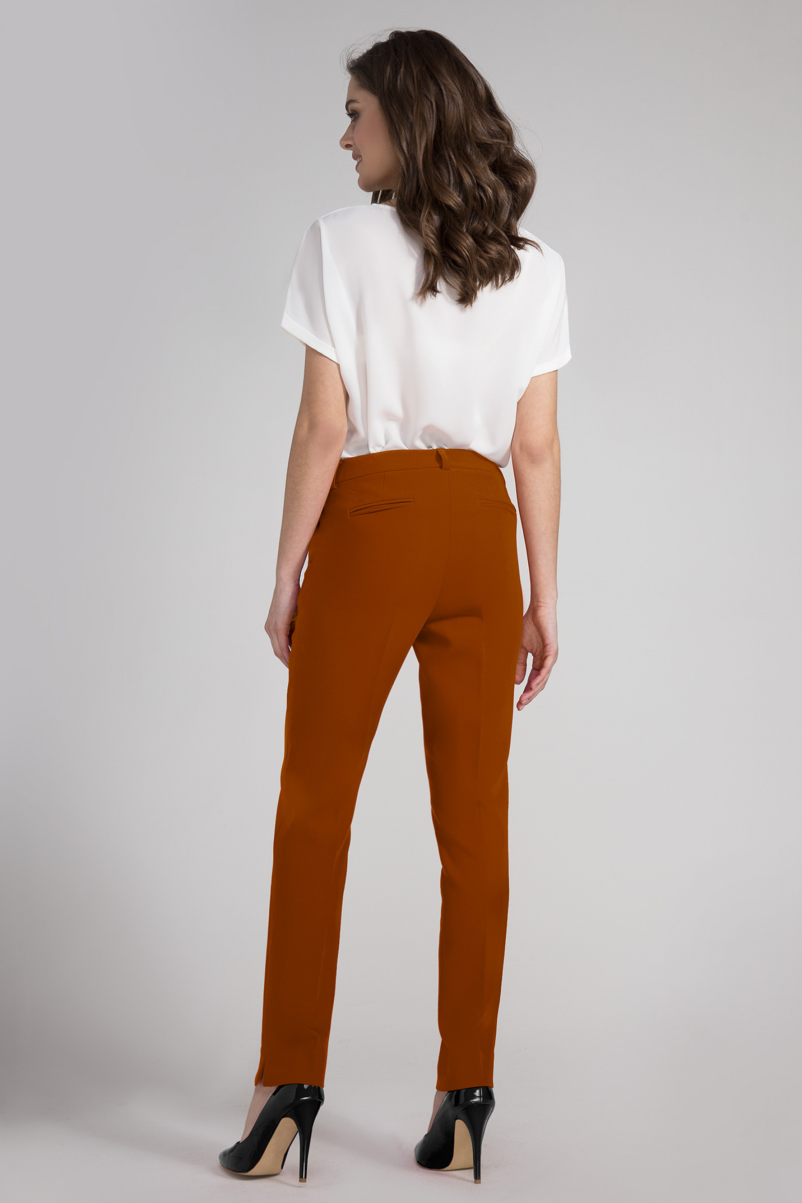 Брюки женские, зауженные к низу, дополнены карманами в боковых швах и их имитацией в задней части изделия. По бокам штанин - небольшие разрезы. Брюки женские зауженные застегиваются на молнию. На поясе располагается потайной крючок-застежка и шлевки для ремня.