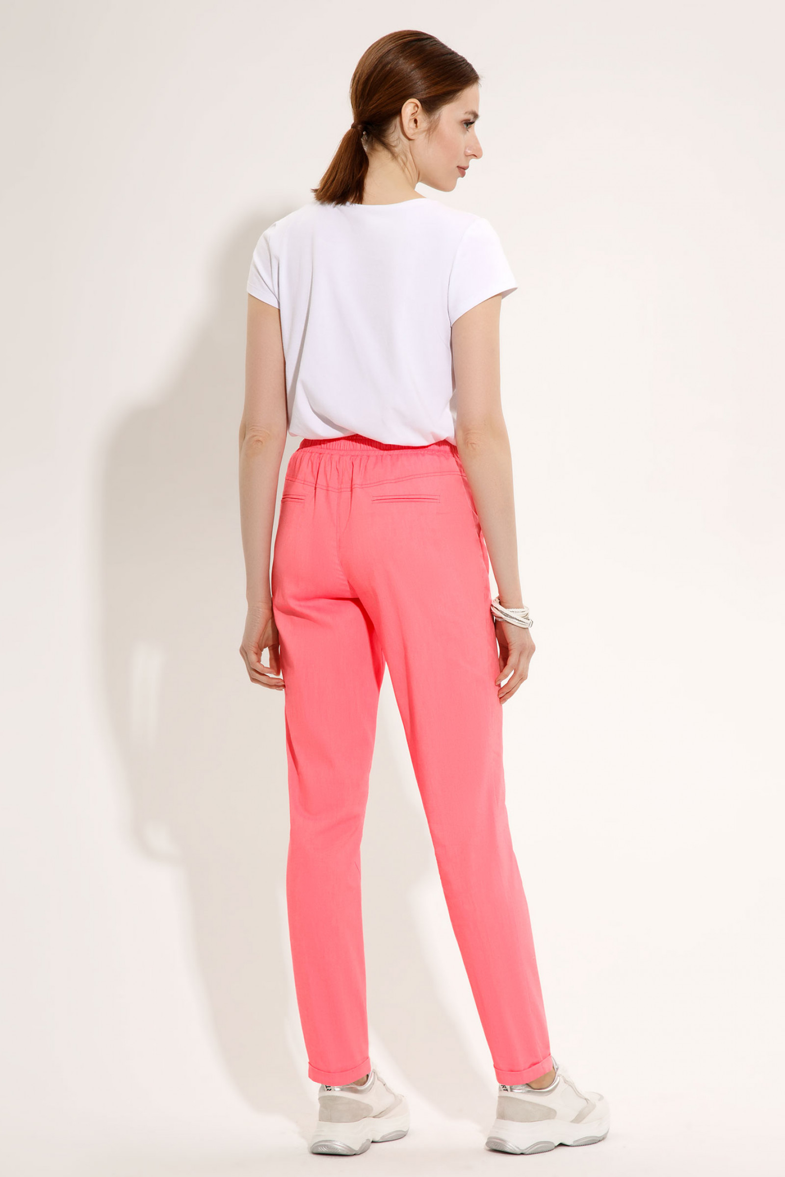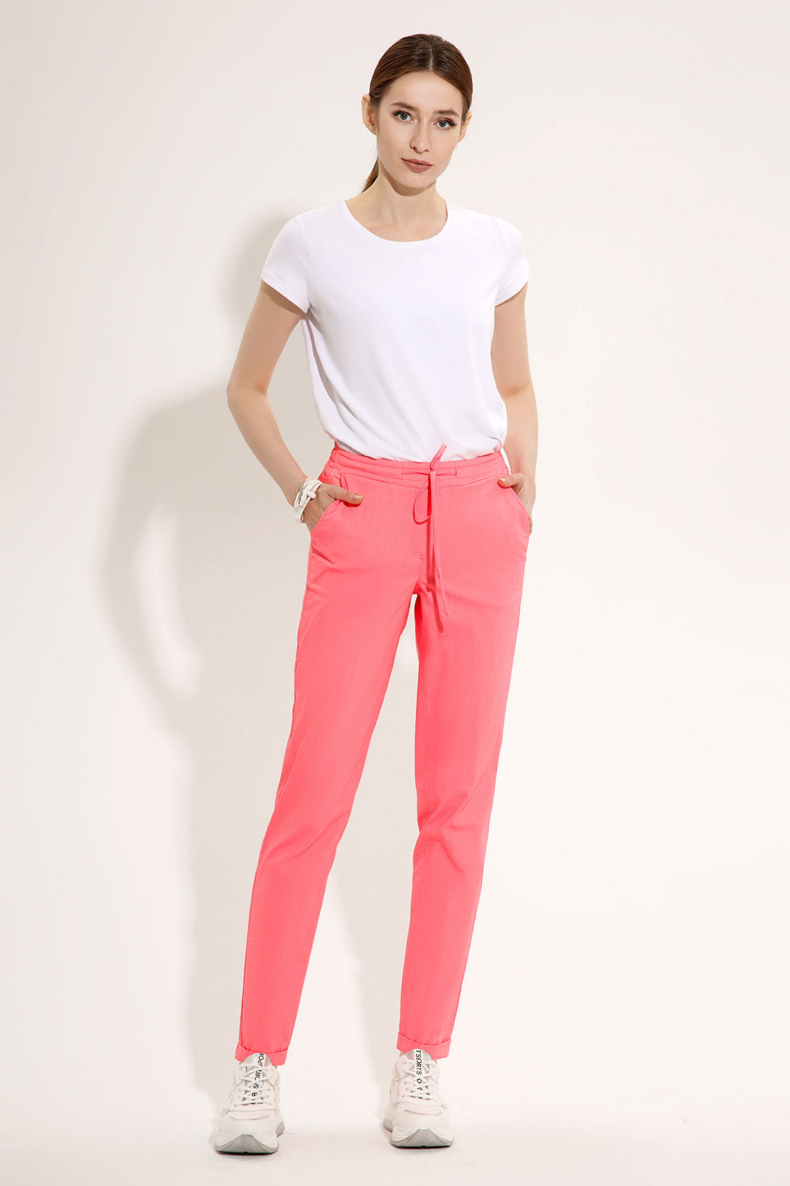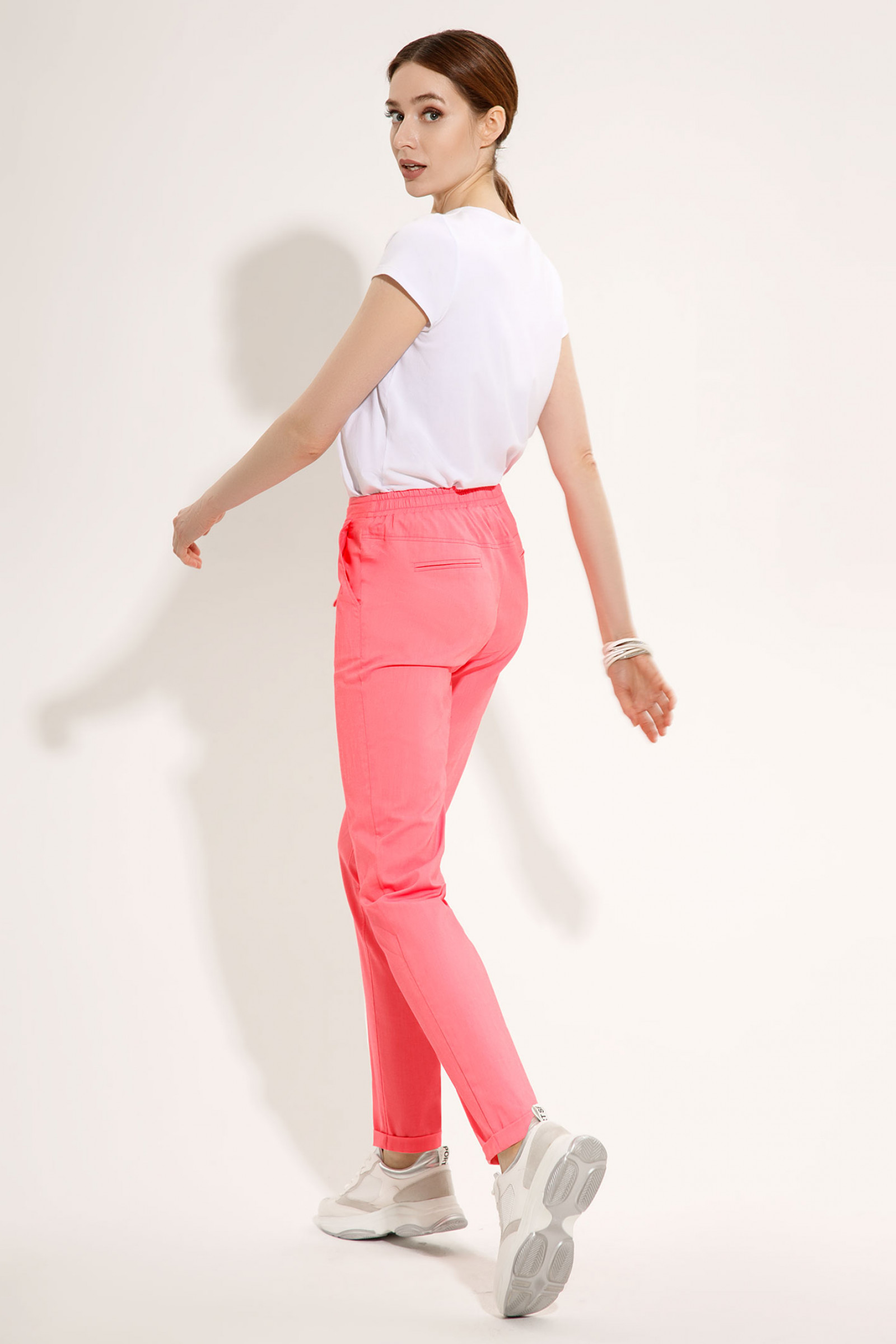 Стильные молодежные брюки модного неонового оттенка из хлопковой ткани с поясом на резинке с декоративным шнурком. Брюки чуть заужены к низу. По переду брюк карманы. На задней части брюк фигурная кокетка и декоративные карманы в рамку. Отличный вариант для активного летнего отдыха.