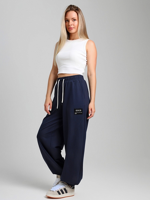 Брюки женские из трикотажного полотна "футер-двунитка", на притачном поясе с эластичной тесьмой внутри, с карманами в боковых швах и отделочными деталями фигурной формы на передних половинах. Нижние срезы брюк обработаны с эластичной тесьмой. По швам притачивания отделочных деталей, декоративных вставок и карманам настрочены отделочные строчки. На левой передней половине брюк ниже кармана настрочен декоративный элемент прямоугольной формы. Через две петли в центре пояса петли продет шнурок, позволяющий регулировать степень прилегания изделия по талии.