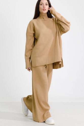 Трикотаж с шерстью, хлопком и акрилом, используемый для этого костюма, известен своей мягкостью и приятной текстурой. Он идеально подходит для демисезонного периода, даря комфорт и стиль в одном флаконе.