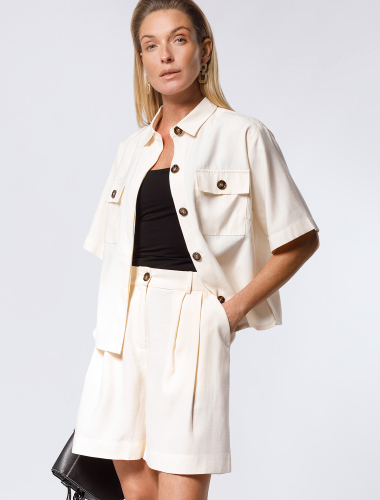 Шорты выполнены из плотного лиоцела. Добавление синтетических волокон в составе изделия предотвращает сминаемость. Эластичный пояс на резинке фиксирует изделие не сковывая движений. Есть дополнительные шлевки для ремня. Свободная модель дополнена боковыми карманами и металлическим логотипом бренда. Для создания завершенного образа сочетайте в костюме с топом D23.058, блузкой D28.054, D29.238, D29.239 и D29.240