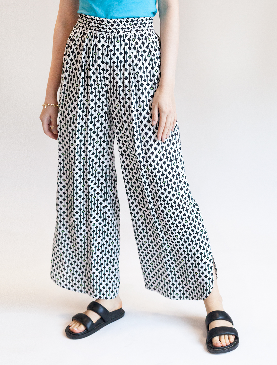 Кюлоты с разрезами выполнены из тонкого лиоцелла. Модель дополнена двумя карманами по бокам и эластичным поясом на резинке. Приятная на ощупь тонкая ткань охлаждает кожу и успокаивающе действует на нее, а крой не ограничивает свободу движений. Графичный принт поддерживает легкий блеск ткани.