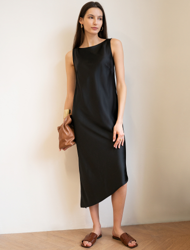 Платье с горловиной формы лодочка выполнено из плотного полуматового сатина, напоминающего натуральный шёлк. Лаконичная модель дополнена ассиметричным низом с разрезом, скроенная по косой струится и переливается при каждом шаге. Ткань почти не мнется и имеет легкий вес. Роскошная модель для праздничного мероприятия, хорошо будет сочетаться с жакетом или кожаным верхом.