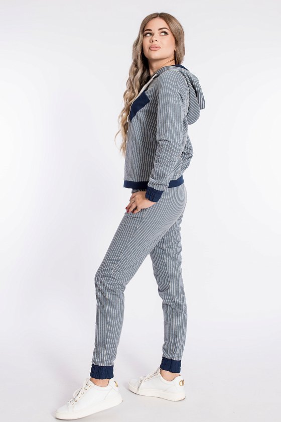 Костюм из футера двухнитки в вертикальную полоску с отделочными деталями изо льна. Толстовка с капюшоном, длинным рукавами на манжетах, с планкой по низу. Спереди расположен нагрудный карман. Ширина капюшона регулируется при помощи шнура. Брюки с боковыми карманами, притачным поясом и манжетами.