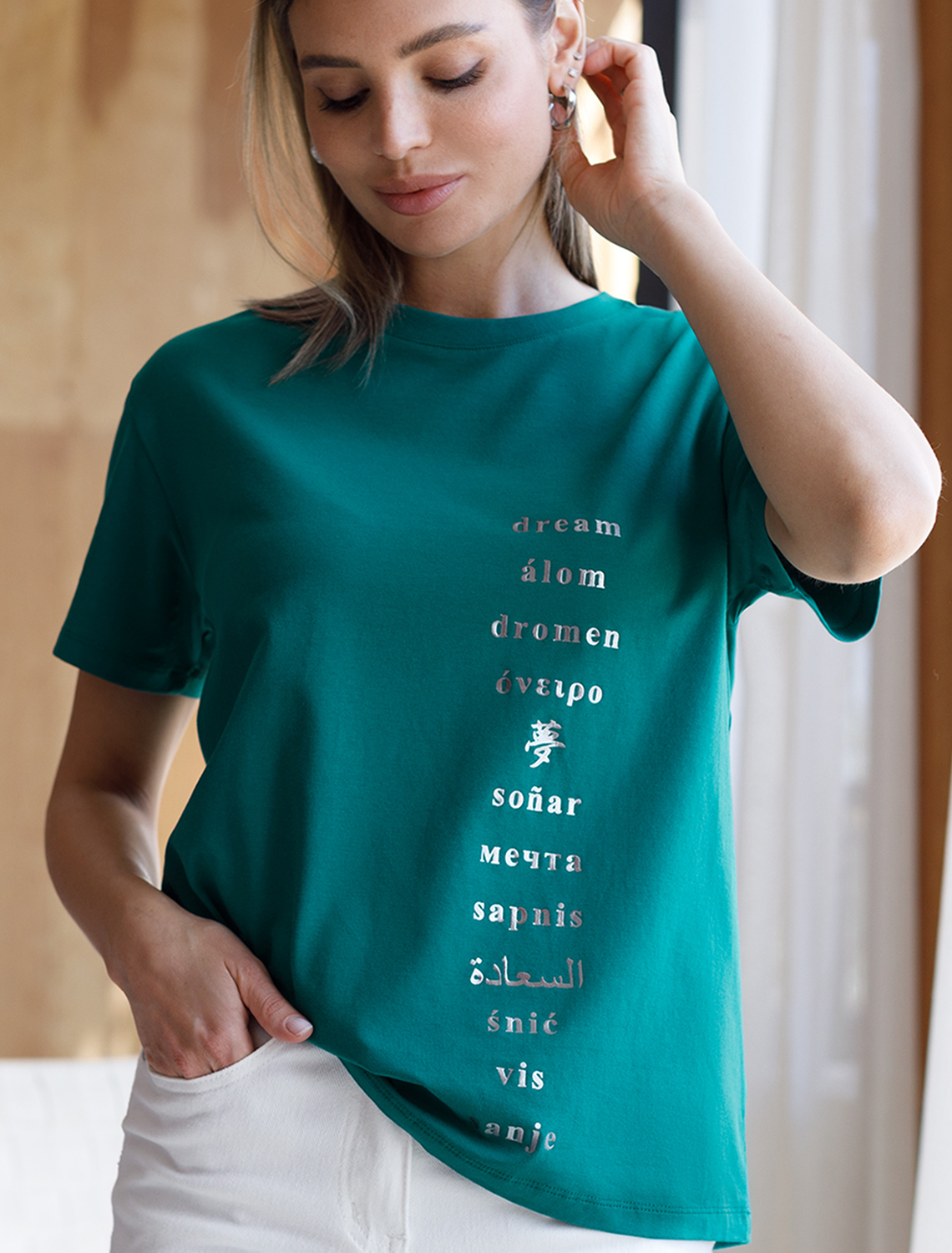 Было:1290руб.Акция:990руб.Футболка из премиального хлопка с принтом «мечта» на разных языках