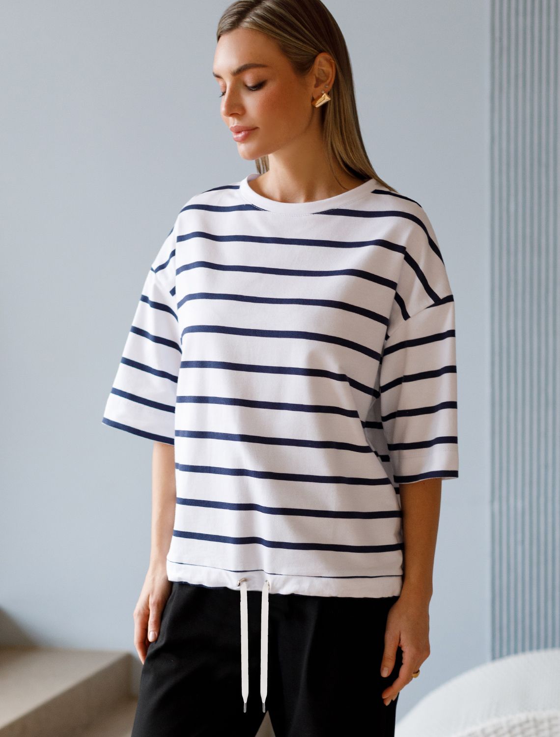 Рост 170, бюст 89, талия 63, бедра 92 Футболка свободного кроя выполнена из 100% хлопкового футера-двухнитки. По низу изделие дополнено регулируемым хлопковым шнуром. Мягкий хлопковый трикотаж гарантирует комфорт даже в жаркое время года. Сочетается в костюме с любыми брюками из футера или джинсами.
