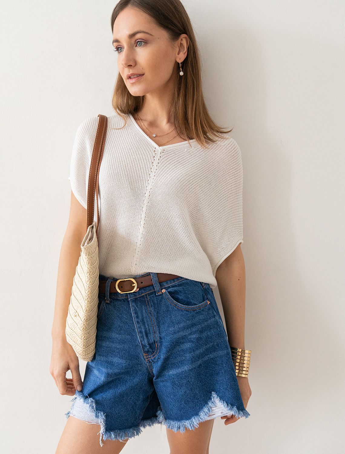 Состав: 100%ХлопокСиние джинсовые шорты с классической посадкой выполнены из плотного100% хлопка с крупными потертостями и необработанным краем. Модель немного расширенная к низу хорошо подчеркивает талию и изгибы тела. Совет стилиста: создать непринужденный образ можно с рубашкой over-size, базовой футболкой, топом и белыми кедами, и яркими мюлями, в любом случае шорты сделают повседневный образ более дерзким.