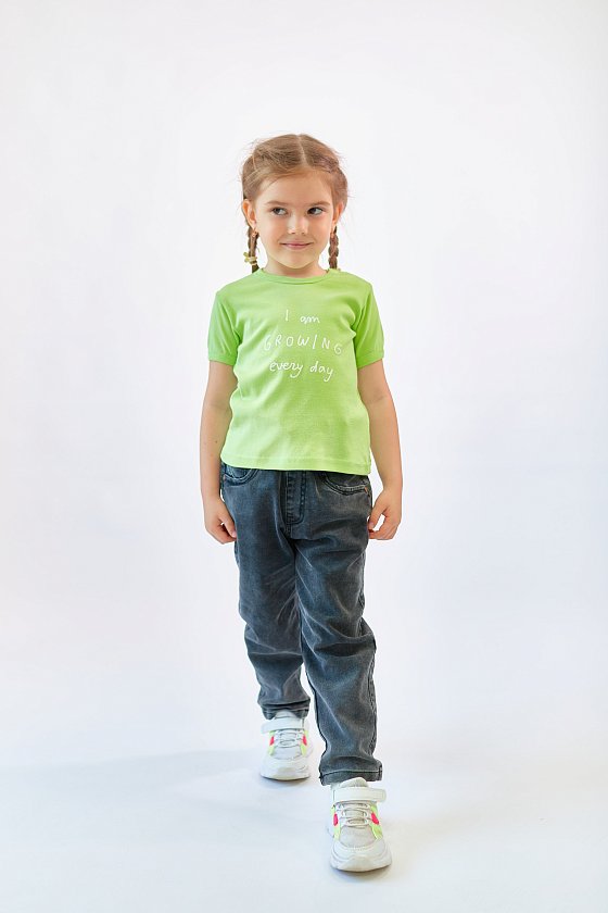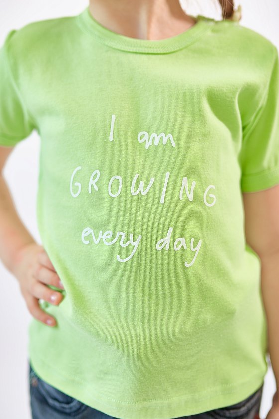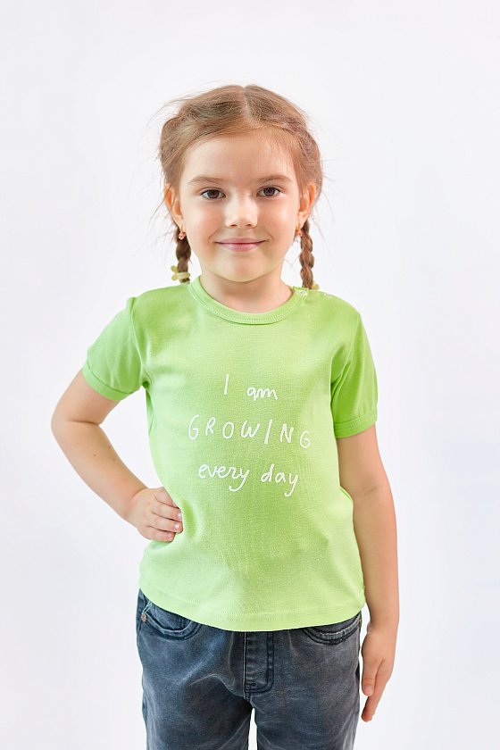 Детская футболка из однотонного ластика. Короткий рукав, круглый вырез горловины с застёжкой на кнопки. Спереди расположен принт.