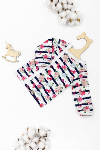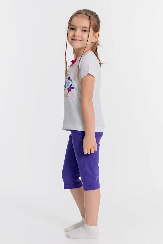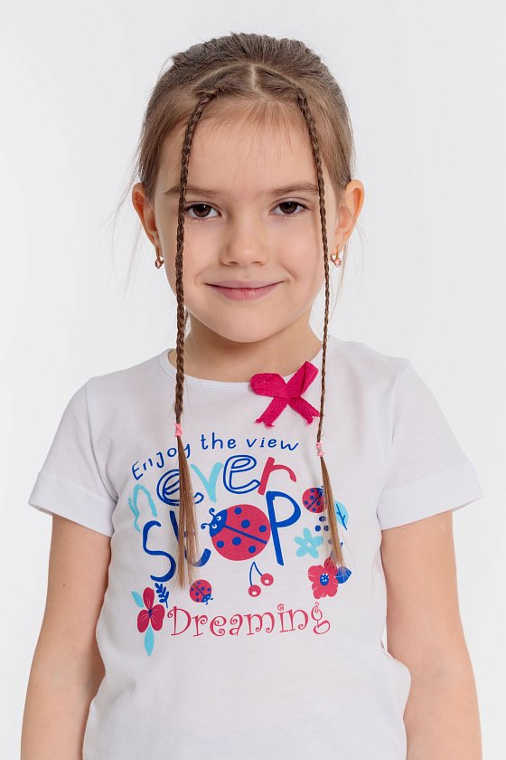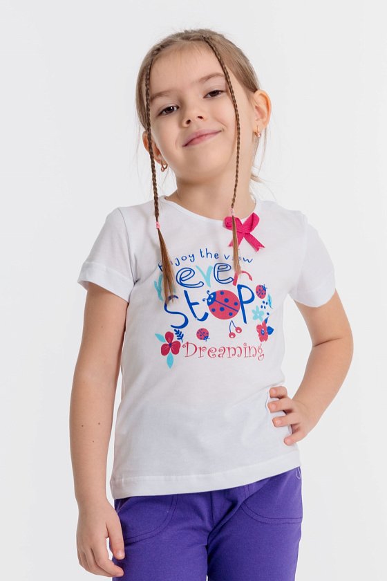 Футболка для девочки из 100% хлопка с коротким рукавом. Застежка на плече на кнопки. В качестве украшения спереди расположен красивый принт и бантик.
