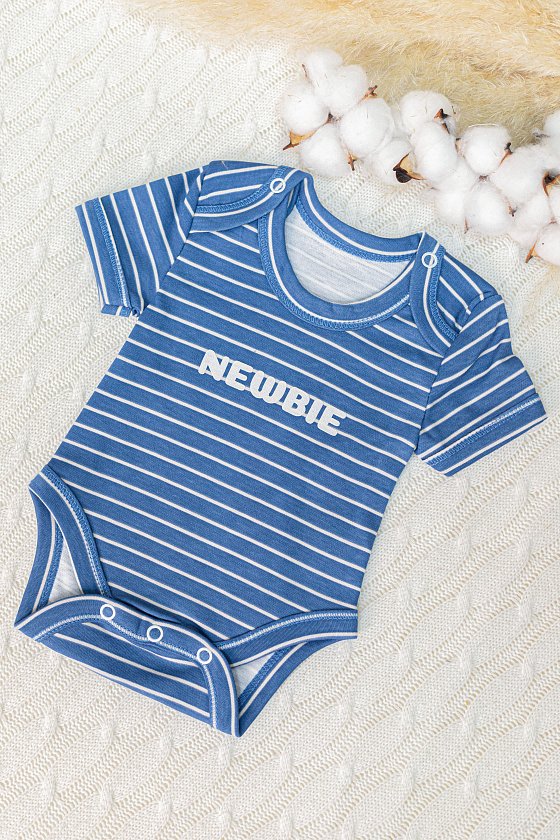 Боди для новорожденных с коротким рукавом из интерлока цвета индиго в полоску. За счет застежек-кнопок в нижней части и на пересечении горловины, переодевание малыша будет удобным. Бейка в цвет основного полотна на горловине, рукавах и по низу придает изделию завершенный вид. Спереди нанесен принт, который добавит изюминку и индивидуальность образу.
