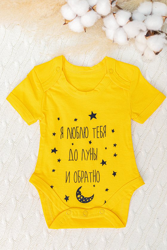 Боди для новорожденных с коротким рукавом из кулирки желтого цвета. За счет застежек-кнопок в нижней части и на пересечении горловины, переодевание малыша будет удобным. Бейка в цвет основного полотна на горловине, рукавах и по низу придает изделию завершенный вид. Спереди нанесен принт, который добавит изюминку и индивидуальность образу.